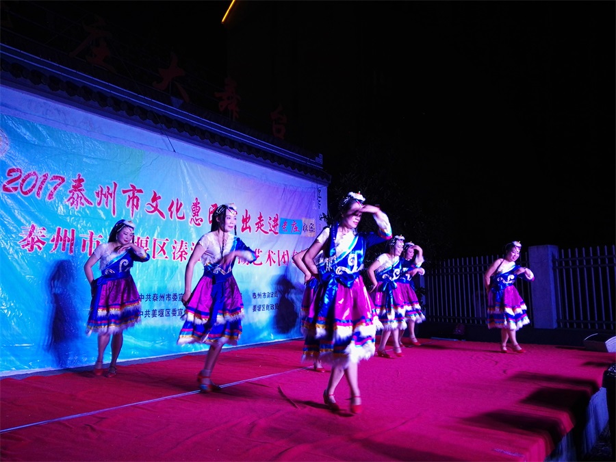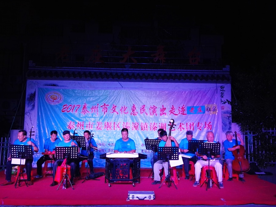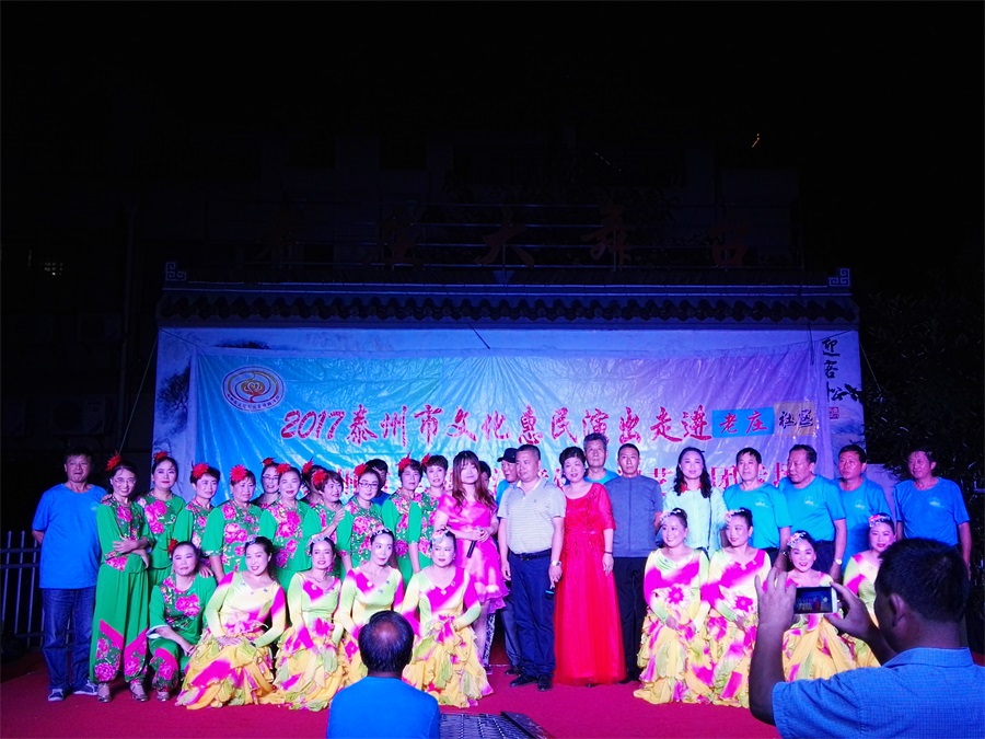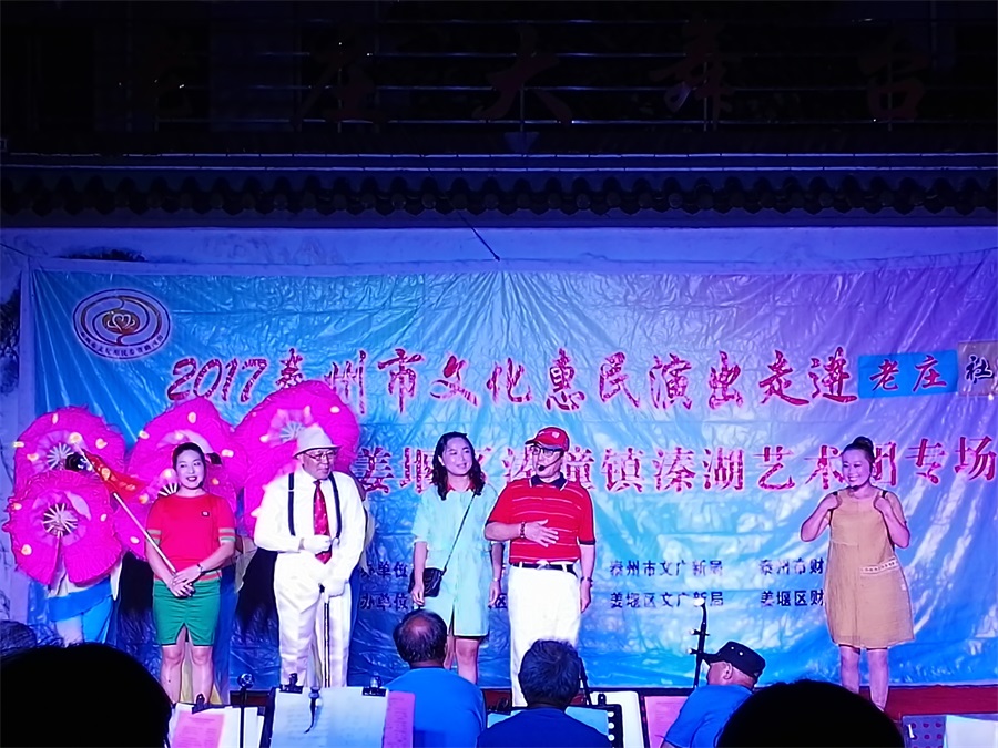 9月8日,秋高气爽姜堰区溱潼镇溱湖艺术团应姜堰镇老庄社区邀请,2017年泰州市文化惠民券专场演出于当晚7点三十分,在社区百姓大舞台上演。为适应观众不同层次的文化欣赏需求,溱湖艺术团精心策划了13个丰富多彩的文艺节目,随着欢快喜庆的音乐响起,舞蹈《红红火火大中华》拉开了演出序幕,当晚演出不仅有激情奔放的民歌与民舞,而且有耳熟能详的戏曲,淮剧《手捧枝头花香藕》,还缴请当地群众上台表演,最后在歌伴舞《阳光路上》结束晚会,整台演出效果好,弘扬社会正气,倡导诚实守信,气氛热烈,掌声不断,赢得了广大观众的一致好评。当天晚上演出时长90分钟,观众达到300多人,优美而精彩的表演,给居民送去一份丰盛的文化大餐。