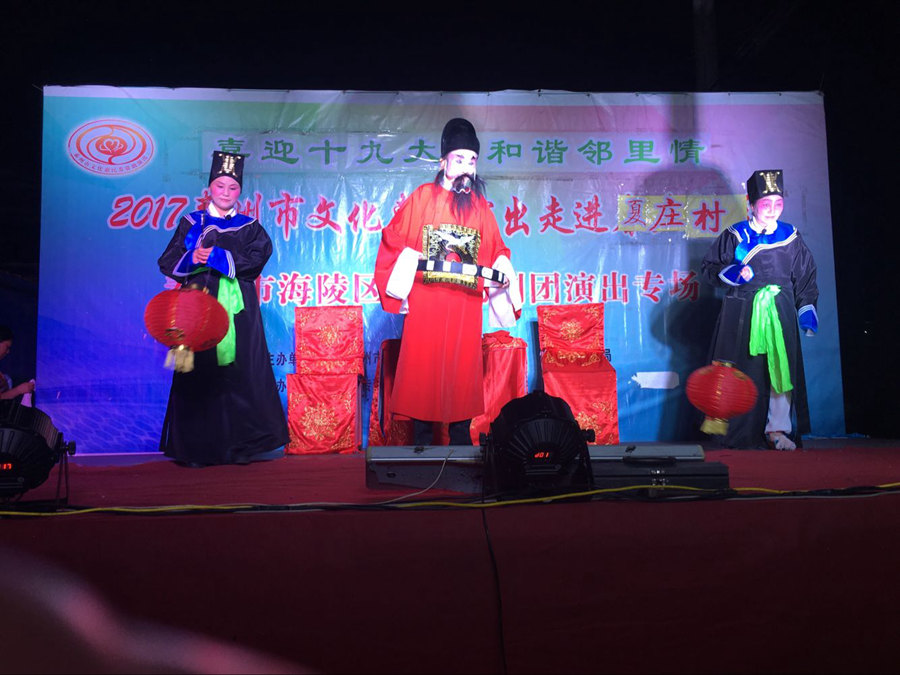 2017泰州市文化惠民演出走进海陵区罡杨镇夏庄村,海陵区小鹰扬剧团专场演出,2017年8月27日晚上在海陵区罡杨镇夏庄村117公交站台停车场成功举办。本场演出演出剧目为大型传统扬剧《分裙记》整本戏,演出时长160分钟,演员们精彩的表演博得了观众的阵阵掌声。演出很成功!感谢村领导提供全方位的服务!
