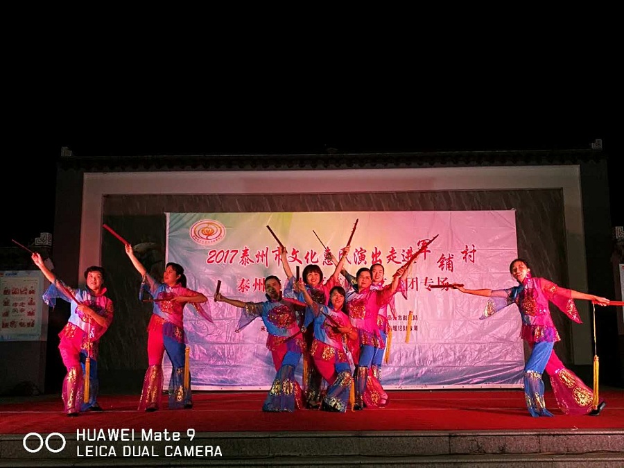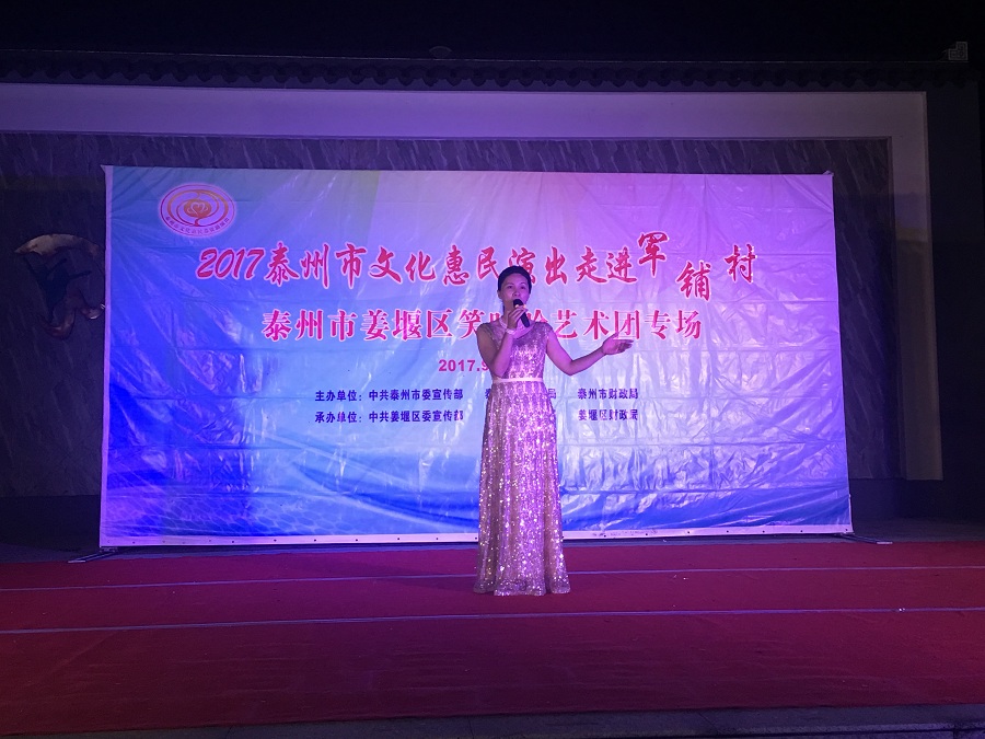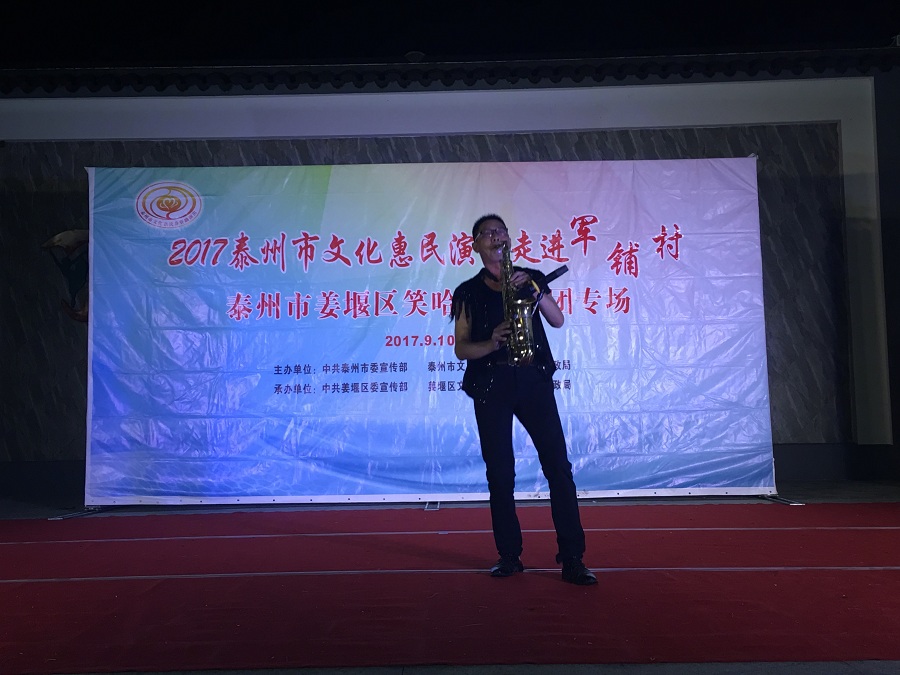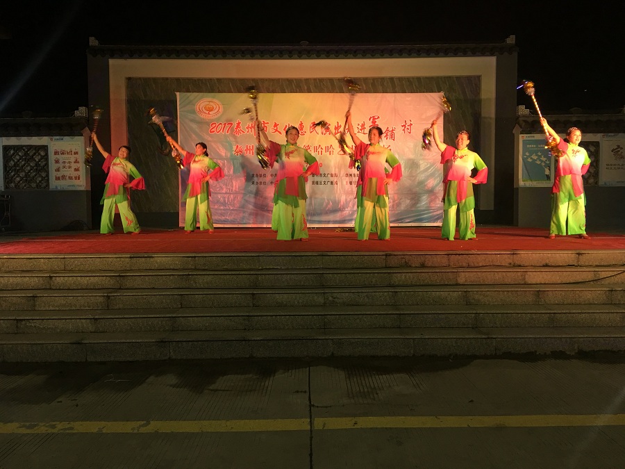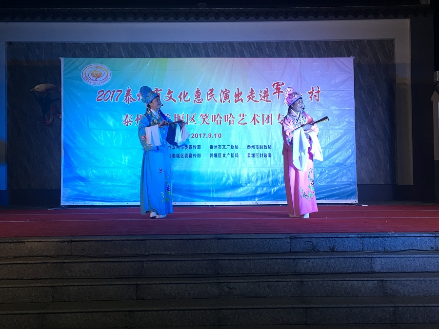 9月10日,姜堰区笑哈哈艺术团文化惠民专场演出走进三水街道军铺村。晚上7点演出在军铺村大舞台准时开始,现场表演的节目有舞蹈《红红火火大中华》、莲花落说唱《莲花一打笑哈哈》、方言韵白《洗澡》《拐过弯来是幸福》萨克斯演奏《北国之春》、表演《回娘家》、天津快板《有话好好说》、相声《趣说泰州话》、表演唱《财政惠民乐农家》、以及独唱等11种形式、12个节目。整台演出时长115分钟,观众约800人左右。节目形式多样、内容丰富,尤其相声、快板、喜剧小品、方言韵白等语言类特色节目赢得了观众的阵阵笑声和掌声,受到村干部、群众的一致好评。