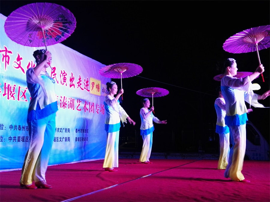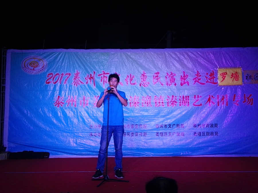 9月13日,秋高气爽姜堰区溱潼镇溱湖艺术团应姜堰镇罗塘社区邀请,2017年泰州市文化惠民券专场演出于当晚7点二十分,在社区百姓大舞台上演。为适应观众不同层次的文化欣赏需求,溱湖艺术团精心策划了13个丰富多彩的文艺节目,随着欢快喜庆的音乐响起,舞蹈《红红火火大中华》拉开了演出序幕,当晚演出不仅有激情奔放的民歌与民舞,而且有耳熟能详的戏曲,淮剧《手捧枝头花香藕》,还缴请当地群众上台表演,最后在歌伴舞《阳光路上》结束晚会,整台演出效果好,弘扬社会正气,倡导诚实守信,气氛热烈,掌声不断,赢得了广大观众的一致好评。当天晚上演出时长90分钟,观众达到400多人,优美而精彩的表演,给居民送去一份丰盛的文化大餐。
