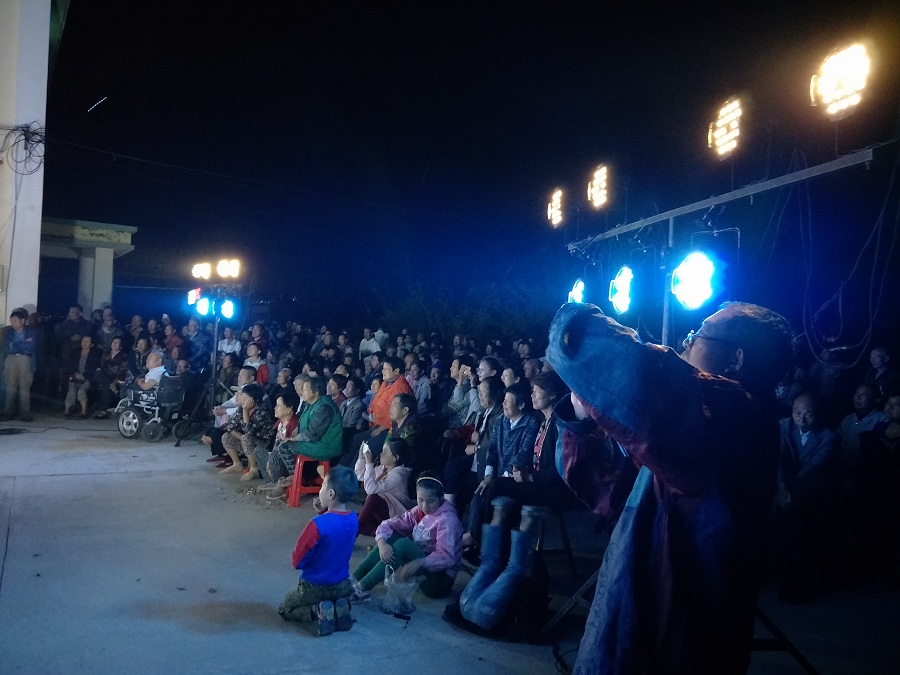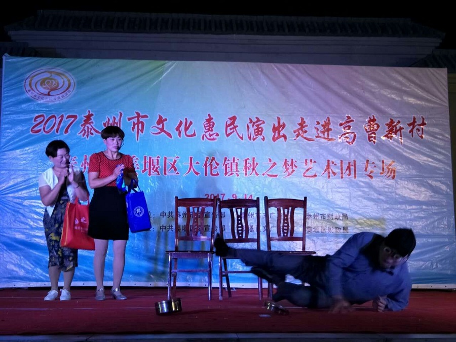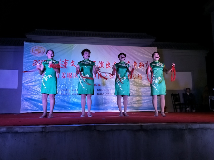 唱着红红火火的歌谣,抒出胸中的豪迈,舞起醉人的红绸,我们和着时代的节拍,应姜堰区蒋垛镇高曹新村邀请,大伦秋之梦艺术团9月14日晚进行专场惠民演出,在深化全国文明城市创建的进程中,高曹新村容村貌,焕然一新,百姓舞台别具一格。由于村里宣传到位,七点不到广场上就坐满了观众,艺术团精心编排了以弘扬社会主义核心价值观,“三大主题”美德善行为主题的多种形式,内容丰富多彩的十多个节目。一个个精彩纷呈,一次次掌声不断,近两个小时的演出给观众带来了美好的文化享受。也给人民留下了深刻的印象。村领导以及老百姓看了这台节目齐夸,秋之梦这台节目紧跟时代,围绕中心,主题突出,贴近生活,欢迎你们下次再来。