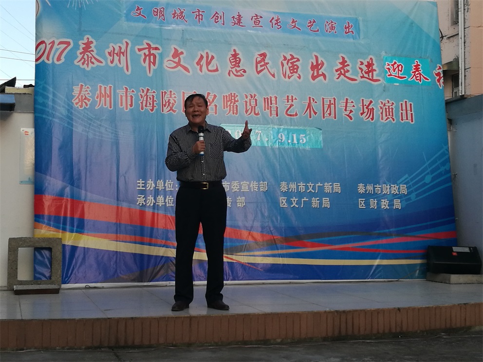 2017.9.15号下午艳阳高照,海陵区名嘴说唱艺术团来到了城东街道迎春社区,演出了一台丰富多彩的文艺节目,为社区群众送来了精神食粮。应观众要求原来90分钟的演出,又延长了30分钟,增加了部分观众喜爱的内容。赢得了社区群众的一致好评。