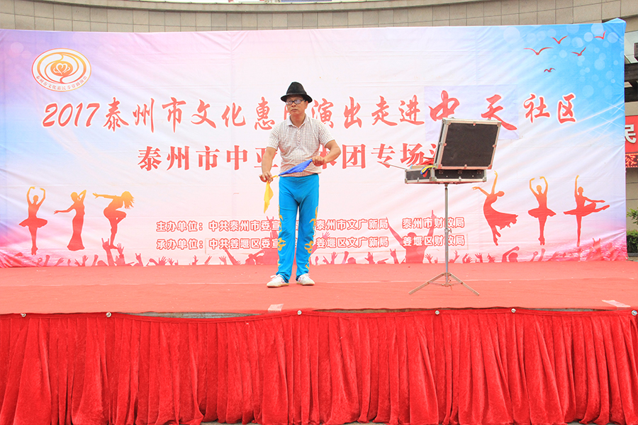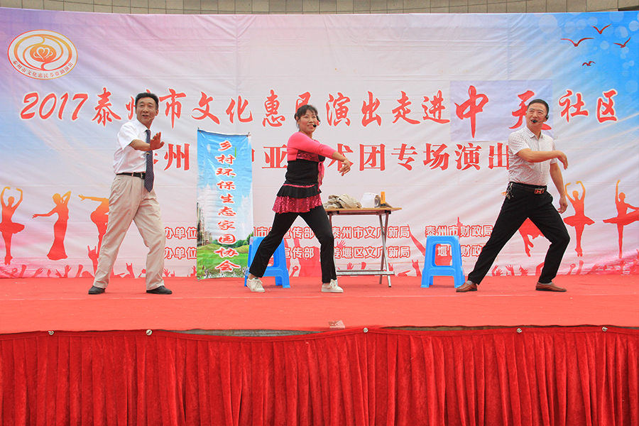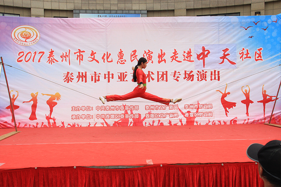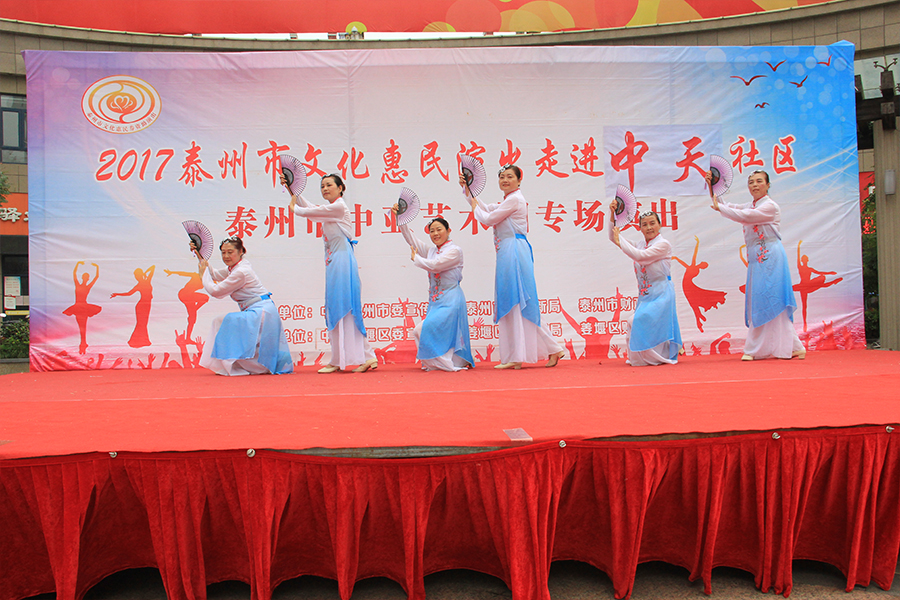 2017年9月22日,中亚艺术团应中天社区邀请,2017年泰州市文化惠民专场演出于当日3点在中天社区社区广场上演。为适应观众不同层次的文化欣赏需求,中亚精心策划了丰富多彩的文艺节目,随着欢快喜庆的音乐响起,开场舞蹈拉开了演出序幕,当日出不仅有激情奔放的歌曲与舞蹈,而且有耳熟能详的戏曲与小品,整台演出效果,弘扬社会正气,倡导诚实守信,气氛热烈,掌声不断,赢得了广大观众的一致好评。当天下午演出时长120分钟,观众达到200多人,优美而精彩的表演,给中天社区送去一份丰盛的文化大餐。