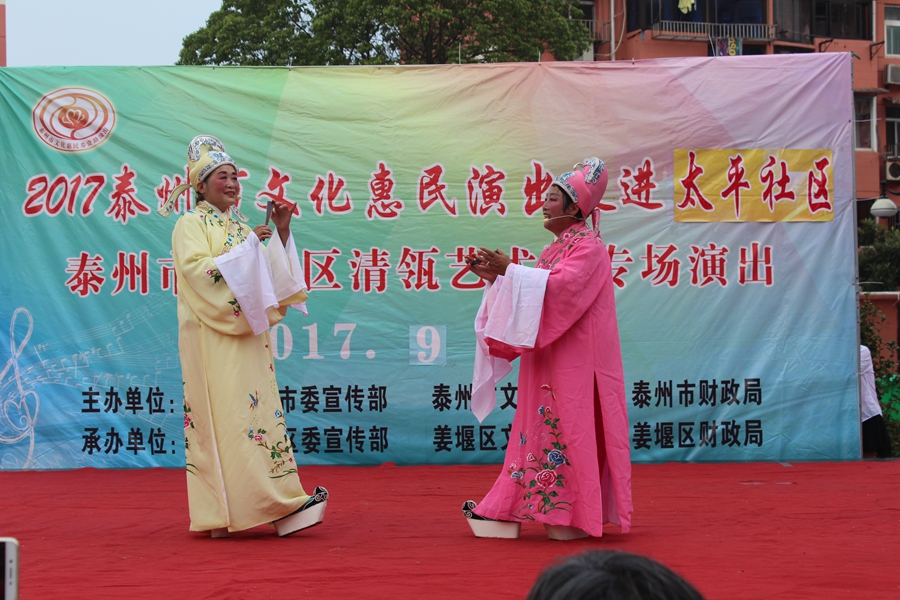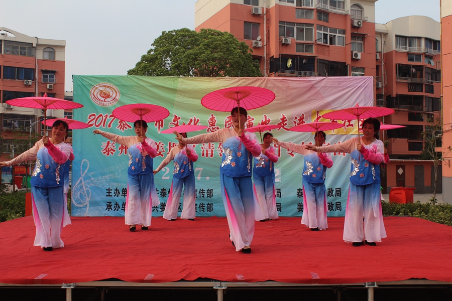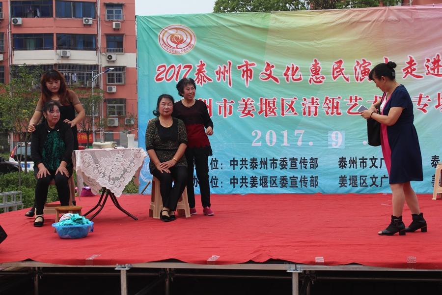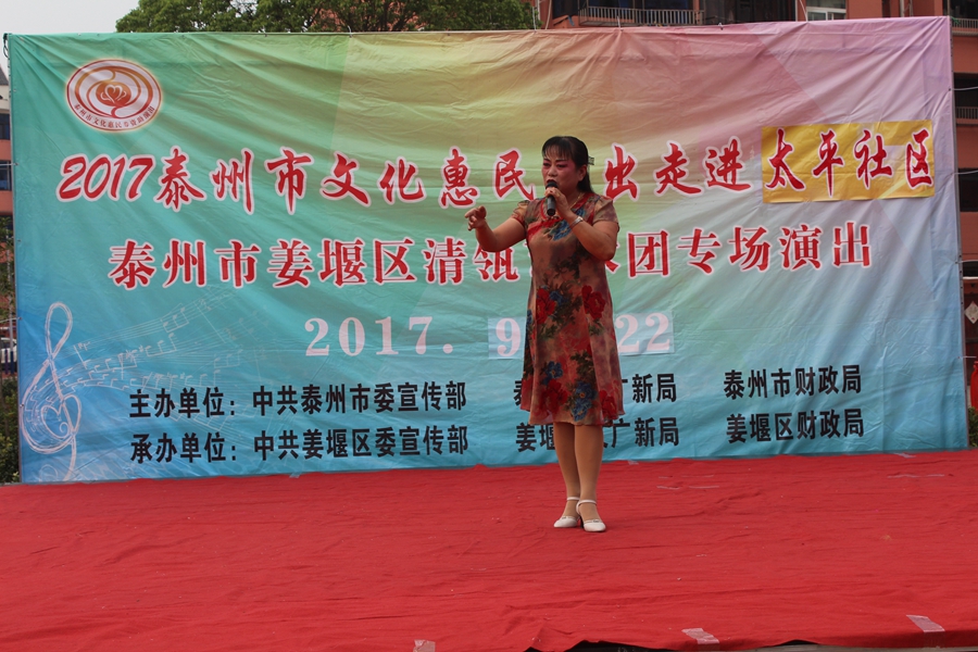 9月22日,秋高气爽,姜堰区清瓴艺术团应太平社区邀请,在社区广场举行了一场惠民演出。为此,团队精心组织了一批观众喜闻乐见的文艺节目。演出在舞蹈《走进新农村》中拉开序幕,演出过程中气氛热烈,掌声不断,整场演出持续了一百分钟,赢得了广大观众的一致好评。
