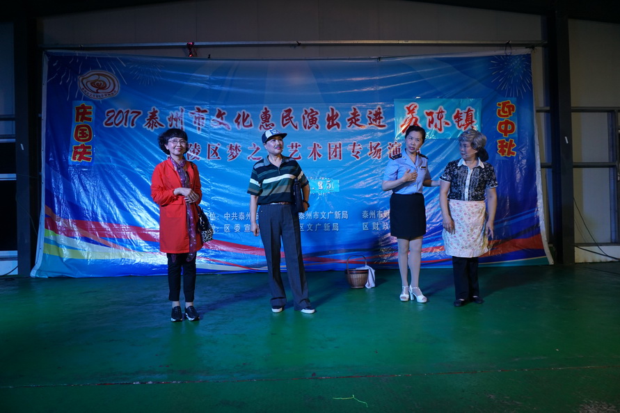 苏陈镇,一个东面与姜堰区相连,西面与海陵区接壤的历史古镇,2017年9月25日苏陈镇的周埭社区迎来了一批特殊的客人-----海陵区梦之韵艺术团。应周埭社区邀请,海陵区梦之韵艺术团走进古镇,走进乡村,为这里的父老乡亲进行文化惠民演出。当天秋雨滂沱,道路湿滑,艺术团的演员们克服恶劣天气带来的各种不便,顶风冒雨赶到了现场,迈进周埭社区的室内百姓大舞台,只见百十位周埭村民早已携家带小济济一堂围坐在舞台前.......。灯光亮起,音乐响起,舞姿飘起,歌喉扬起.......,村民们随着精彩节目的一一的登场,时而笑逐颜开,时而自我陶醉,时而掌声回应......。为了准备这场演出,艺术团探究古镇乡村的文化底蕴和淳朴民风,优中选优编排了十四个精彩的节目.......,但当报幕员与观众依依惜别时,村民观众们依然余兴未尽,连声欢呼再来一个,于是艺术团又加演了一个节目......。两个小时的演出为古镇乡村带来久久的欢快。