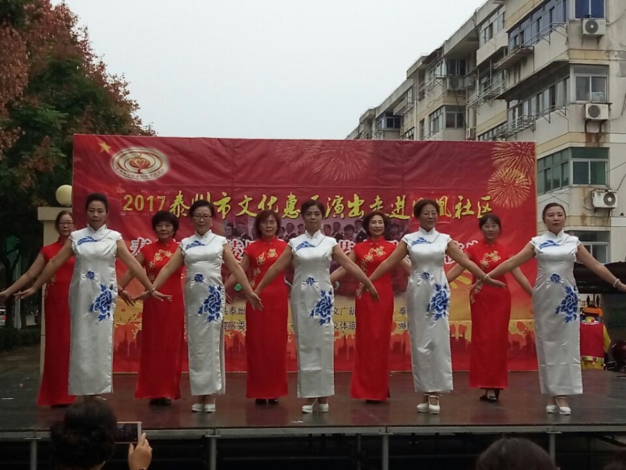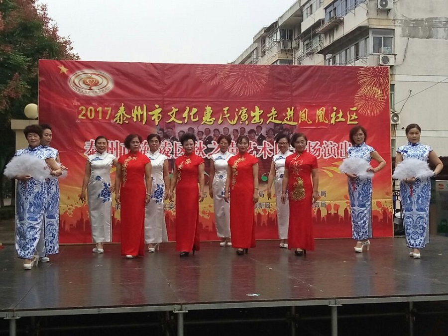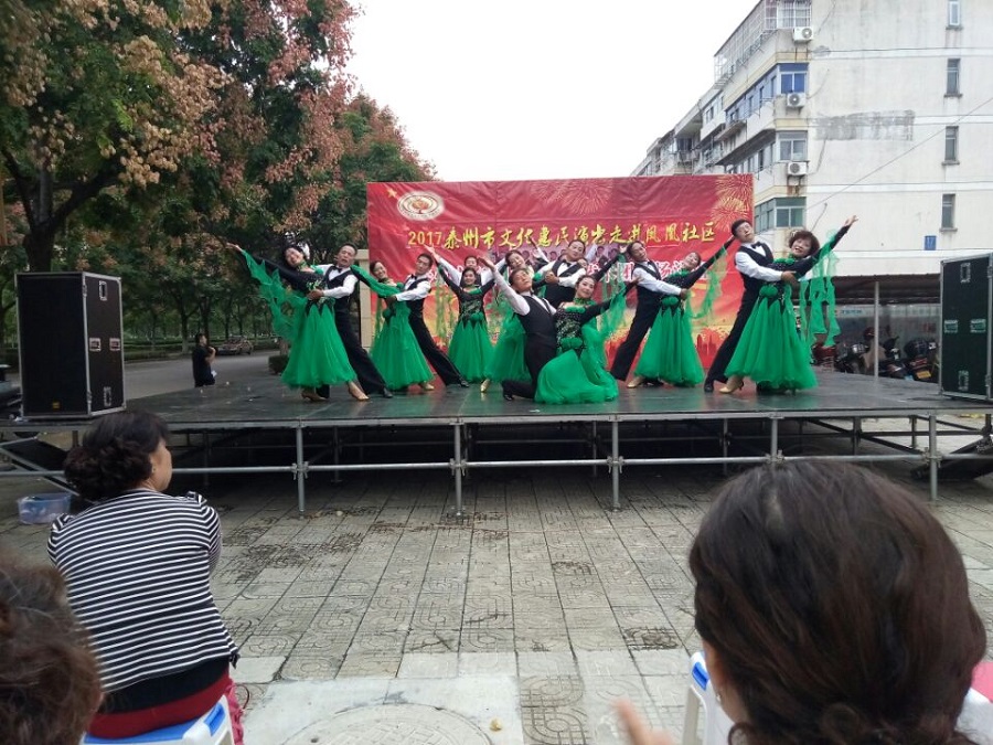 2017年9月27日下午3点00分,泰州市海陵区秋之声艺术团应泰州海陵区凤凰社区邀请惠民演出走进凤凰社区。当天下午在三号区南门外广场演出,虽然下午的天气阴有时有毛毛细雨,观众达一百多人早早来到演出现场。演出节目共有17个,其中舞蹈美丽中国梦、旗袍走秀好一朵茉莉花、男声四重唱少林少林、京剧梨花颂、前门情思大碗茶等节目的精彩表演让全场掌声不断,把演出推向高潮,当谢幕曲难忘今宵奏响时,观众依依不舍,整场演出给观众留下了良好的印象。