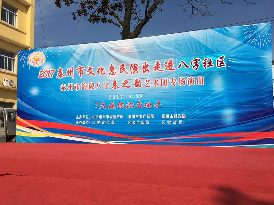 海陵春之韵艺术团走进城中街道八字社区,9月28日下午3点半,春之韵艺术团在八字社区7天连锁酒店惠民演出。二十人的乐队,中西合璧,奏出江南丝竹的优美和电声管乐的气势。一百多名观众欣赏了器乐合奏、独奏、歌曲、戏曲和舞蹈。表演者充分展示才气,观众兴高采烈。整台演出90多分钟,在欢呼和掌声中结束。