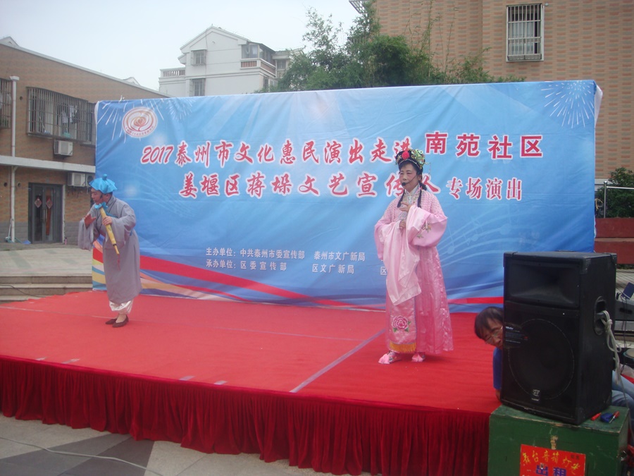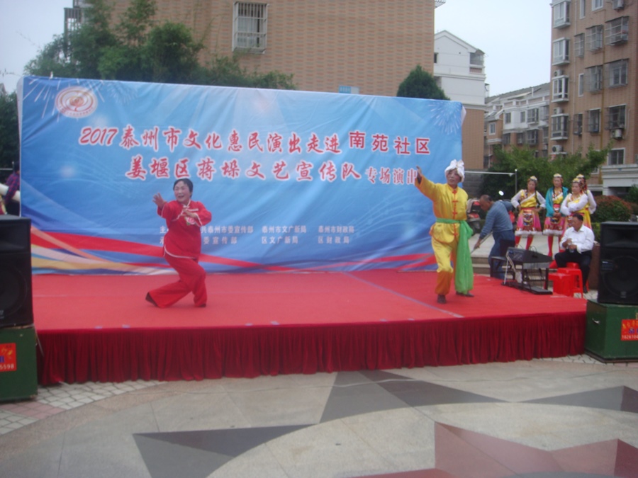 2017年9月27日,姜堰区蒋垛文艺宣传队走进姜堰区罗塘街道南苑社区,下午3点为南苑居民惠民演出丰富多彩的文艺节目,节目形式有扬剧《双下山》、黄梅戏《路遇》、小品《一头精失算》、表演唱《双回门》、舞蹈《赞歌》等。演出时长100分钟,300多观众掌声不断,笑声不断,都说漂亮。