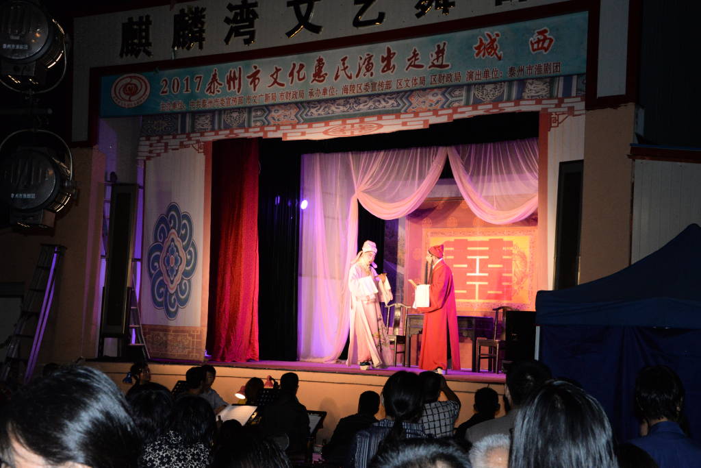 9月24日晚7:30分应海陵区城西街道办事处的邀请,泰州市淮剧团文化惠民演出活动走进了城西街道麒麟社区文艺大舞台,为社区居民带来了一台优秀传统淮剧《阎惜姣》。此剧是根据京剧大师周信芳先生的代表作《乌龙院》移植改编,环环相扣的剧情始终紧扣着观众的神情,舞台上演员精湛专业的表演在两个半小时的演出中赢得了观众数十次的掌声,居民陈先生说:“专业剧团的演出就是精彩,很正规,我经常跟随你们剧团演出路线后面看戏,欢迎你们常来我们基层演出。”一句句朴实的语言深深地鞭策着我们前行,今后一定继续创作人民喜爱接地气的优秀作品奉献给广大观众。