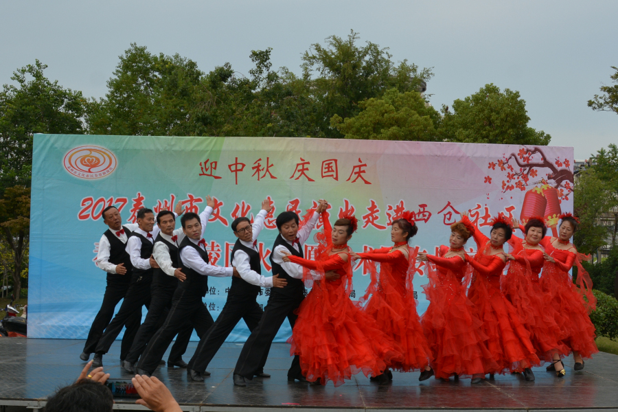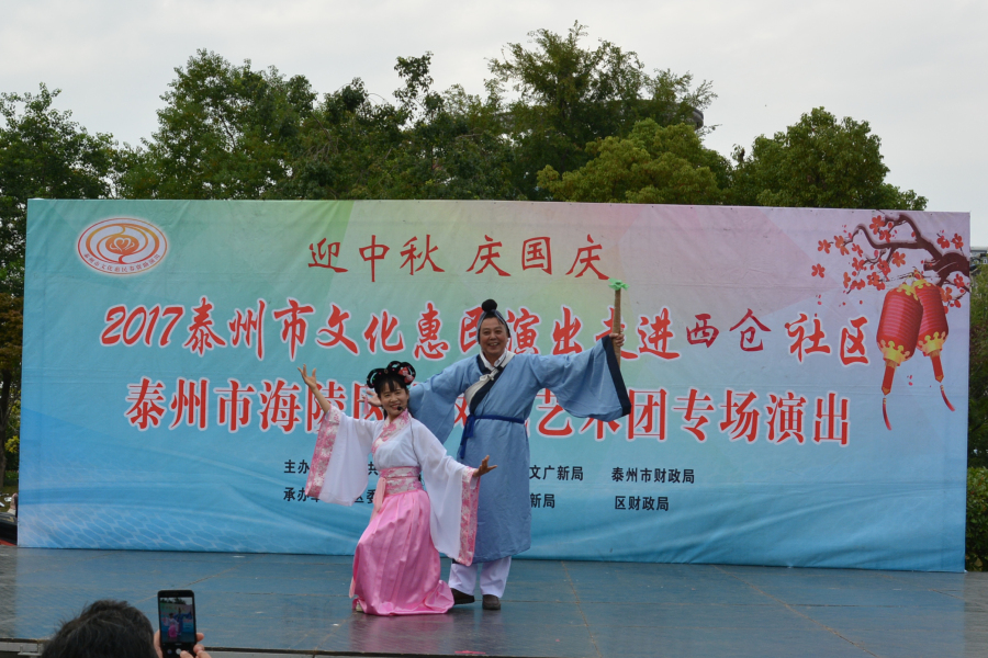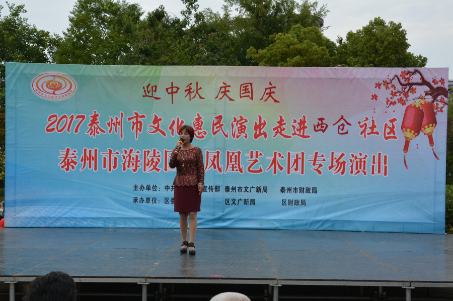 9月29日下午,火凤凰艺术团在海陵区城西街道西仓社区(招贤桥西侧的海阳园)进行《迎中秋 庆国庆》专场文化惠民演出,这一专场文化惠民演出惠及东至卤汀河,南至东进西路,西至江州路,北至海阳路的西仓社区所有居民。这里环境优美,居民们有在家门口看戏的文化需求,火凤凰艺术团为此精心准备了16个节目,让大家在门口享受了一次文化大餐。演出结束后,有几个居民还拉着演员的手,非常高兴地说:“你们演的节目精彩,我来晚了,请告诉我明天在那,我还去看”,演员热情的回答“明天在迎春社区”,他们流露出了满意的笑容“那明天见”。