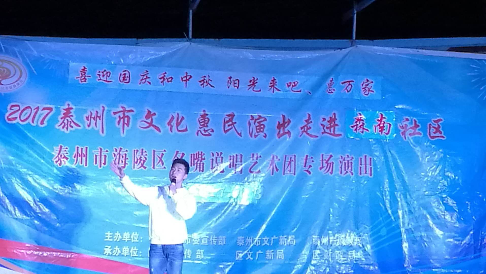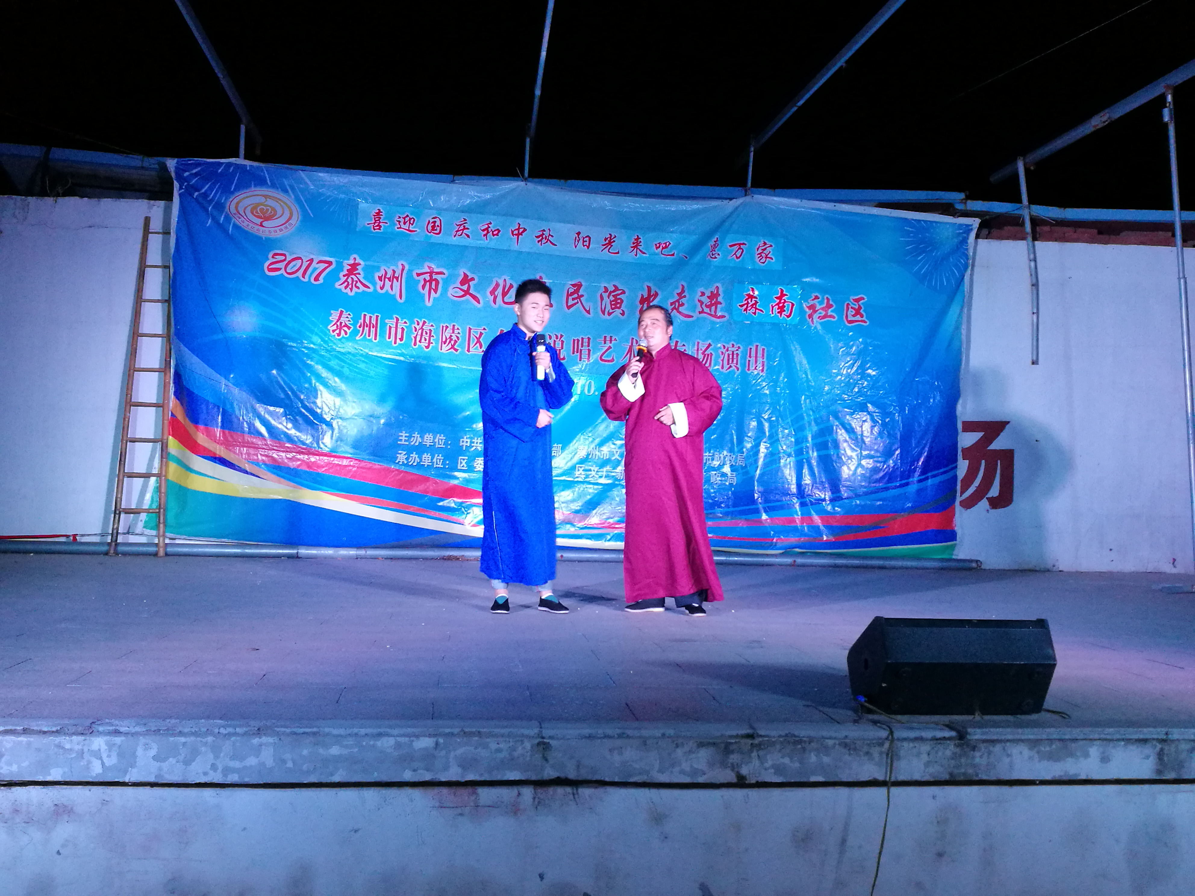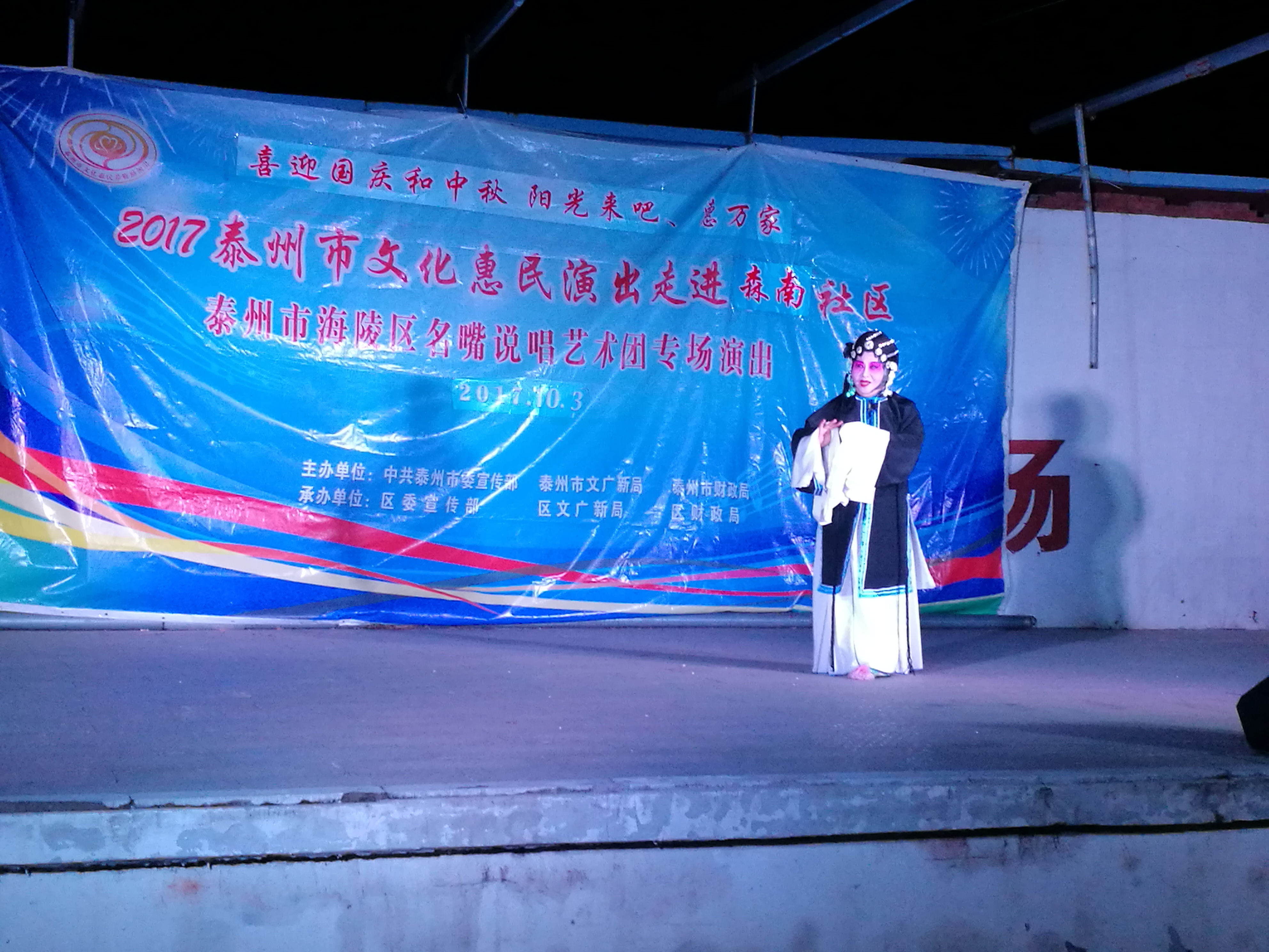 2017.10.3海陵区名嘴说唱艺术团来到了,城西街道森南社区,在中秋佳节到来之际给社区百姓带来了一台精彩的文艺节目。演出中途天空飘起了毛毛细雨,但精彩的节目吸引了现场的观众,观众们冒着细雨继续欣赏,直到演出结束还恋恋不舍。