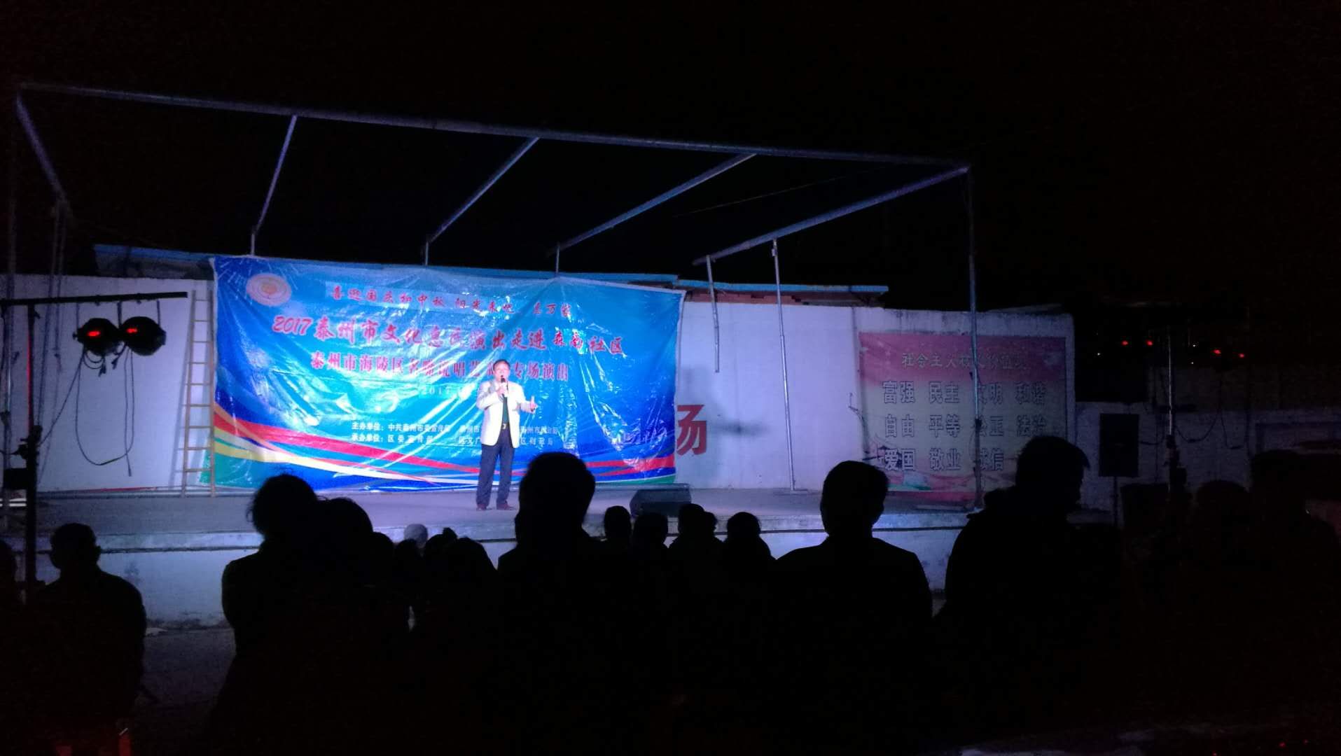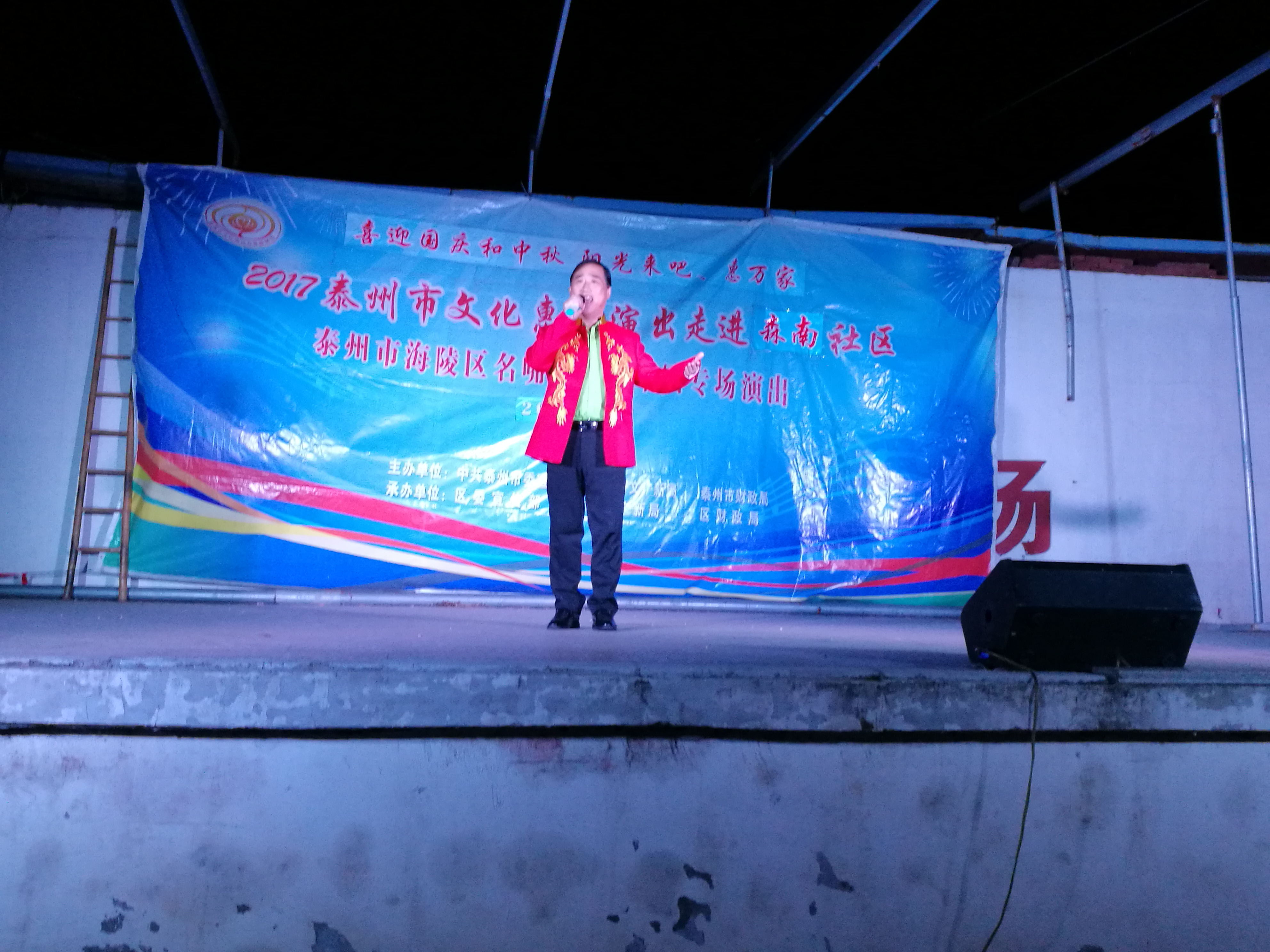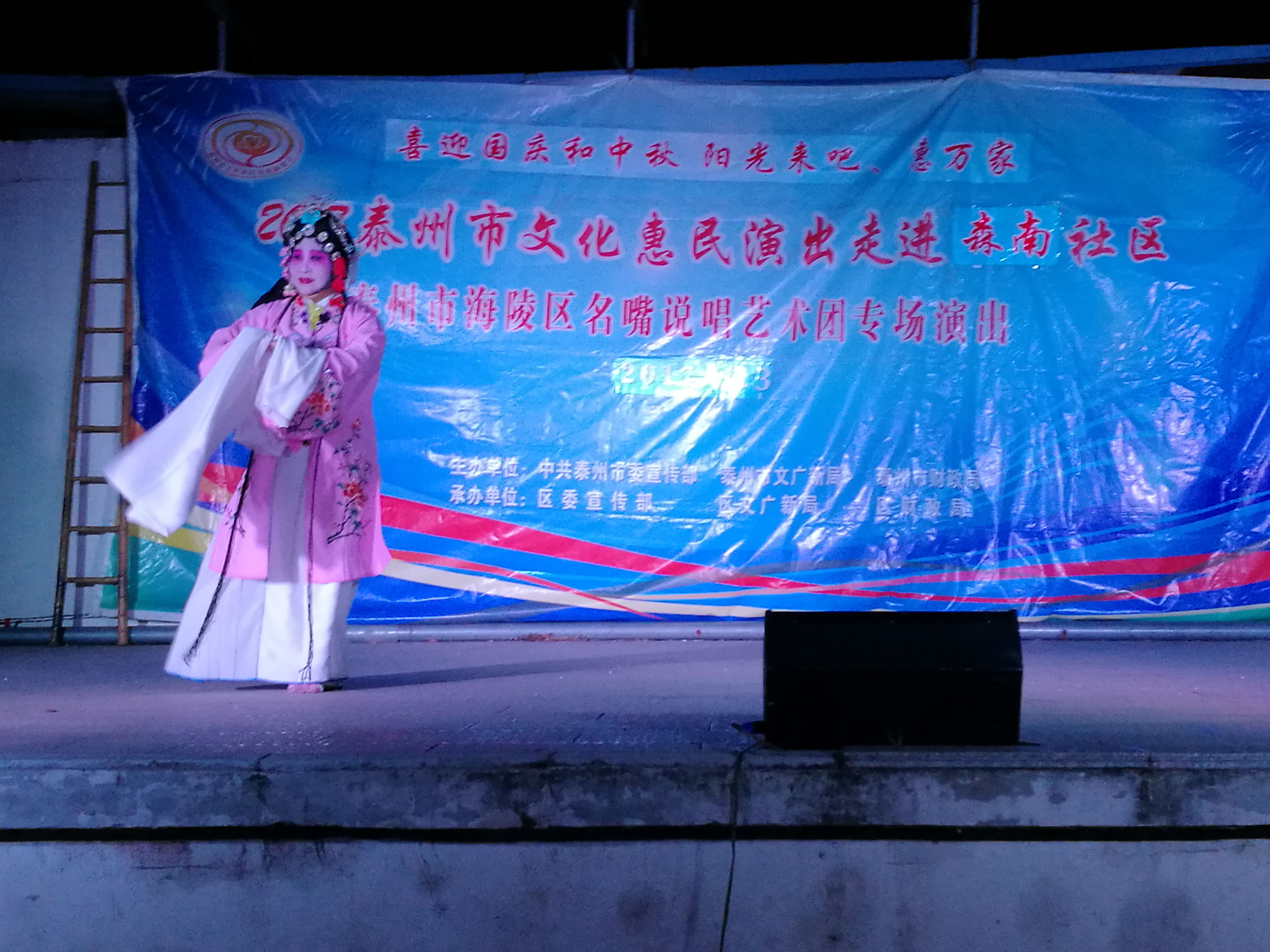 2017.10.3海陵区名嘴说唱艺术团来到了,城西街道森南社区,在中秋佳节到来之际给社区百姓带来了一台精彩的文艺节目。演出中途天空飘起了毛毛细雨,但精彩的节目吸引了现场的观众,观众们冒着细雨继续欣赏,直到演出结束还恋恋不舍。