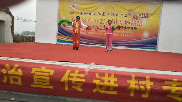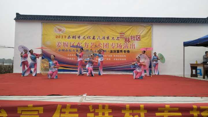 10月10日下午,姜堰区东方艺术团走进姜堰区三林社区,演出在热烈欢快的舞蹈《微笑》中拉开了帷幕,优美的舞蹈《江南梦》、女声独唱歌曲《万水千山总是情》、歌曲《山歌好比春江水》、富有地方特色的莲湘舞《杨柳青》、通俗易懂的方言小品《良心发现》……引得台下观众的阵阵掌声。
