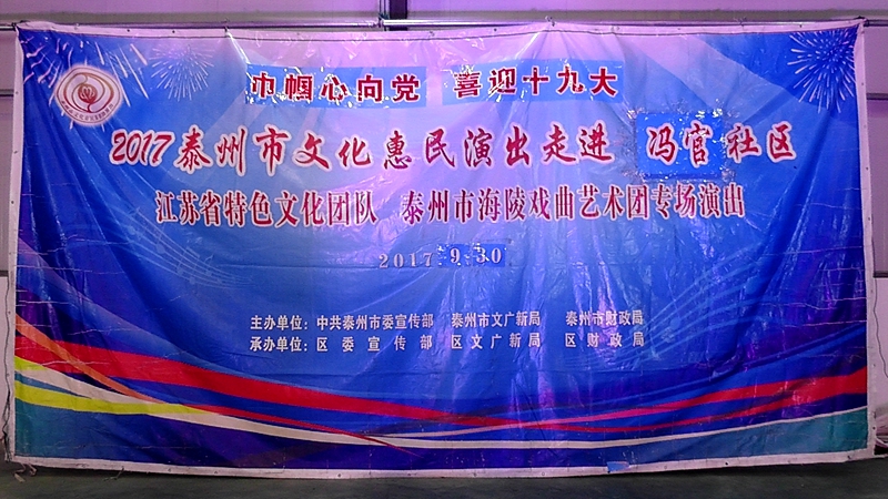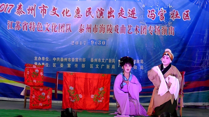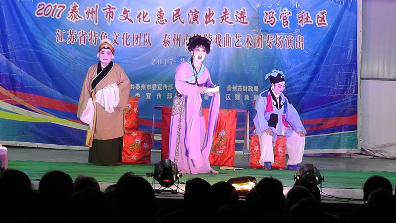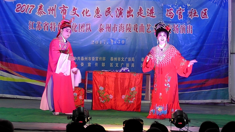 泰州市海陵戏曲艺术团于2017年9月30日晚19点30分在海陵区罡杨镇冯官社区演出大型优秀传统扬剧——《夜明珠》。我团参演人员25人,由于冯官社区积极宣传,前来看戏的群众近500人,人民需要文化,文化需要人民,演出现场气氛热烈,观众掌声不断,演出圆满成功。这更加激起我们为老百姓排好戏、演好戏、唱好戏。把泰州市文化惠民演出活动锦上添花,更上一层楼。