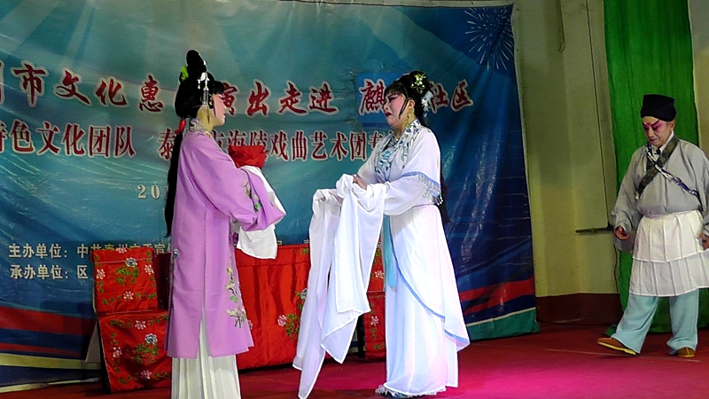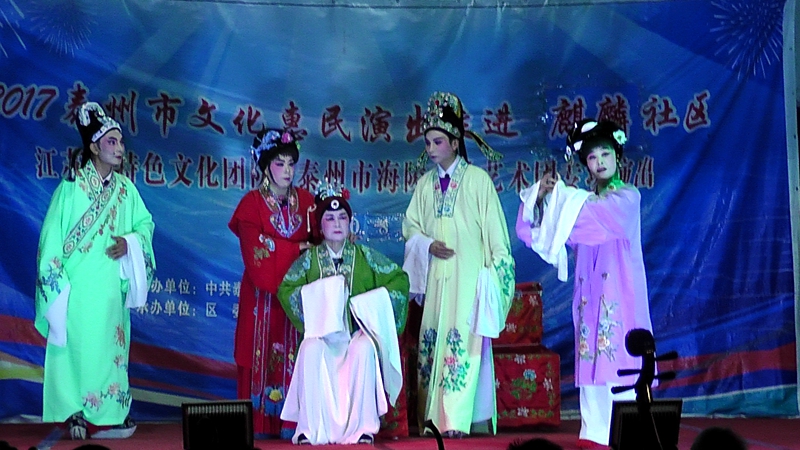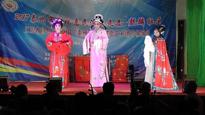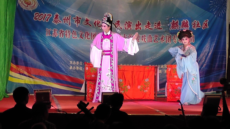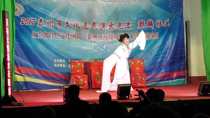 泰州市海陵戏曲艺术团于2017年10月08日晚19点30分在海陵区城西街道麒麟社区演出大型优秀传统扬剧——《逃婚的新娘》。我团参演人员25人,由于麒麟社区积极宣传,前来看戏的群众近300人,人民需要文化,文化需要人民,演出现场气氛热烈,观众掌声不断,演出圆满成功。这更加激起我们为老百姓排好戏、演好戏、唱好戏。把泰州市文化惠民演出活动锦上添花,更上一层楼。