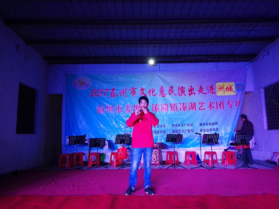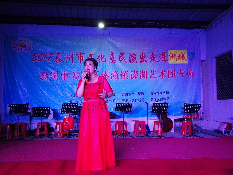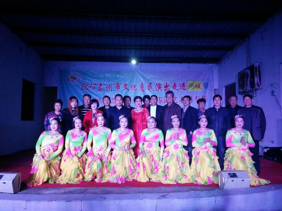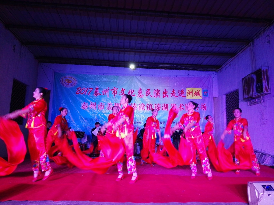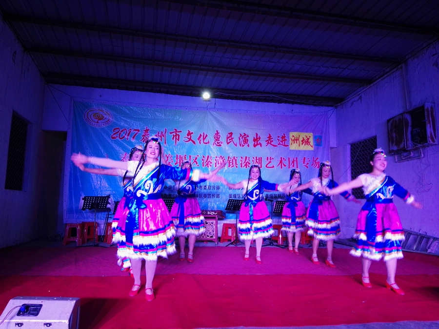 10月18日,秋高气爽姜堰区溱潼镇溱湖艺术团应姜堰区溱潼镇洲城村邀请,2017年泰州市文化惠民券专场演出于当晚6点30分,在村百姓大舞台上演。为适应观众不同层次的文化欣赏需求,溱湖艺术团精心策划了14个丰富多彩的文艺节目,随着欢快喜庆的音乐响起,舞蹈《红红火火大中华》拉开了演出序幕,当晚演出不仅有激情奔放的民歌与民舞,而且有耳熟能详的戏曲,淮剧《手捧枝头花香藕》,还缴请当地群众上台表演,最后在歌伴舞《阳光路上》结束晚会,整台演出效果好,弘扬社会正气,倡导诚实守信,气氛热烈,掌声不断,赢得了广大观众的一致好评。当天晚上演出时长120分钟,观众达到400多人,优美而精彩的表演,给村民送去一份丰盛的文化大餐。