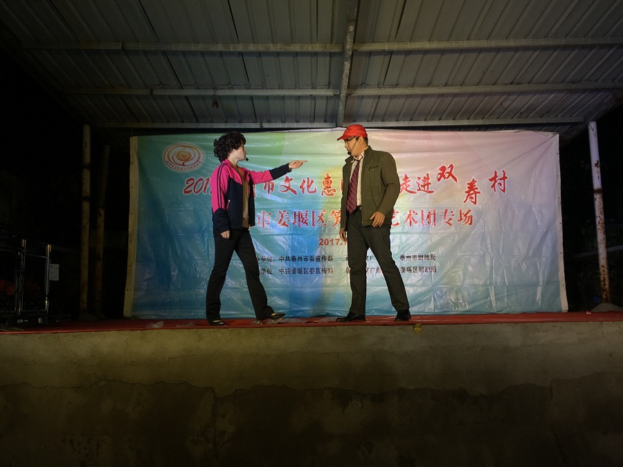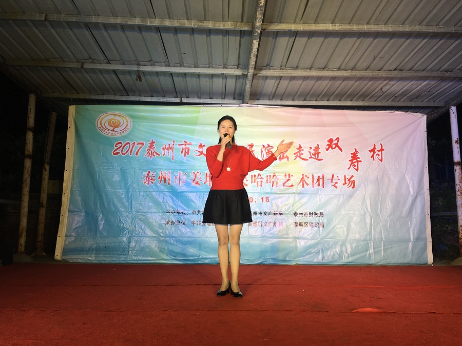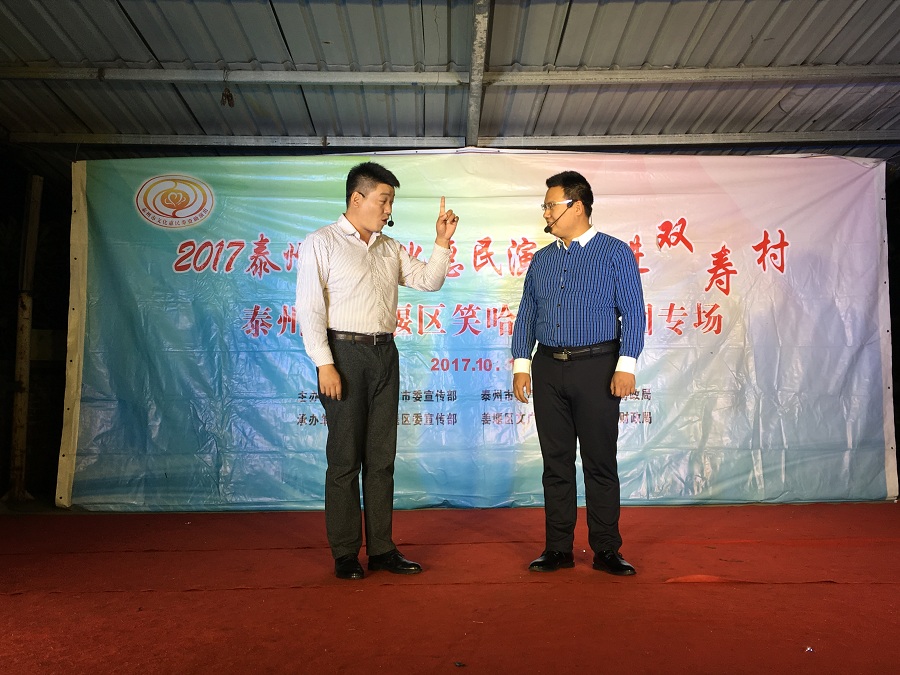 10月18日,姜堰区笑哈哈艺术团文化惠民专场演出走进双寿村。晚上7点演出在双寿村大舞台准时开始,现场表演的节目有舞蹈《红红火火大中华》、莲花落说唱《莲花一打笑哈哈》、方言韵白《路在脚下》《拐过弯来是幸福》萨克斯演奏《北国之春》、表演《回娘家》、天津快板《有话好好说》、相声《趣说泰州话》、表演唱《财政惠民乐农家》、以及独唱等11种形式、12个节目。整台演出时长115分钟,观众约300人左右。节目形式多样、内容丰富,尤其相声、快板、喜剧小品、方言韵白等语言类特色节目赢得了观众的阵阵笑声和掌声,受到村干部、群众的一致好评。