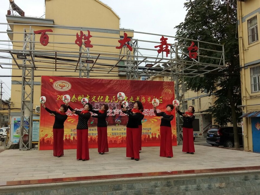 2017年10月20日下午3点30分,泰州市海陵区秋之声艺术团应海陵区城西街道邀请,惠民演出走进海光新村社区。当天下午在海光新村社区内广场演出。下午二点多钟,社区内的观众就陆续不断的到达现场,临近演出时观众已达百拾人,演出节目共有17个,其中午蹈美丽中国梦、走秀远方的思恋、男声四重唱少林少林、京剧梨花颂、前门情思大碗茶等节目的精彩表演让全场掌声不断,把演出推向高潮,当谢幕曲难忘今宵奏响时,观众依依不舍,整场演出给观众留下了良好的印象。