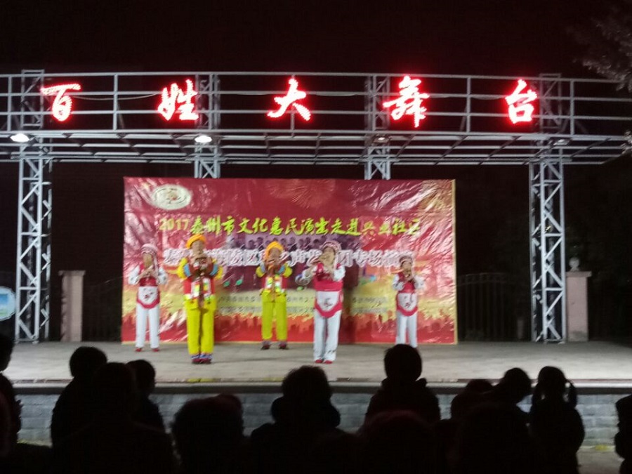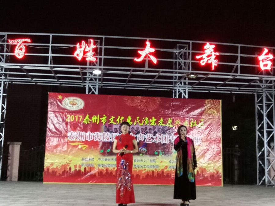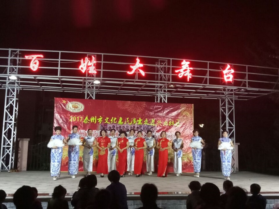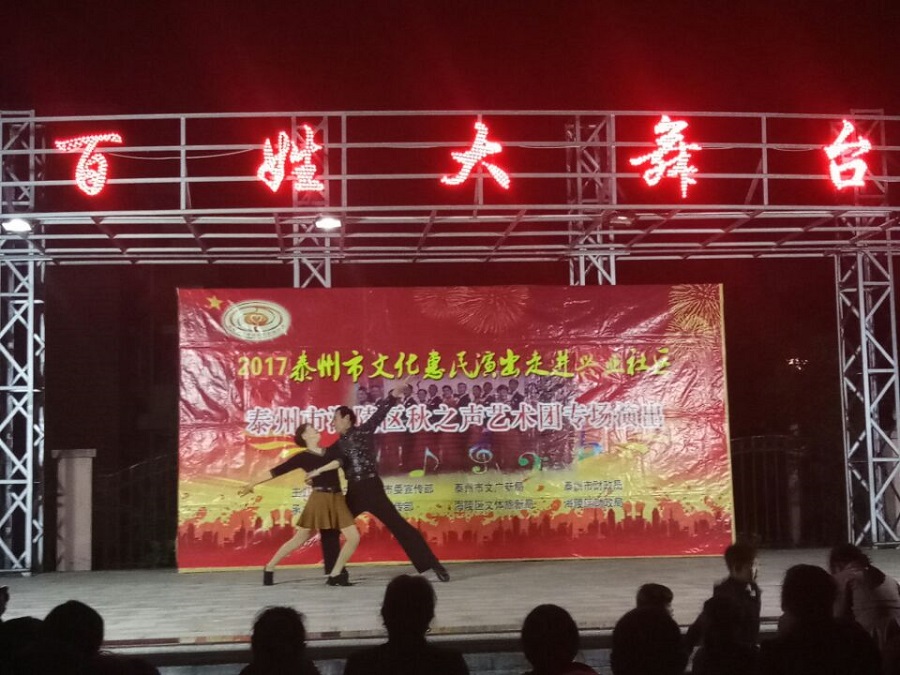2017年10月20日晚上7点00分,泰州市海陵区秋之声艺术团应泰州海陵区城西街道邀请,惠民演出走进兴业社区。当天晚上7点在兴业社区内广场演出,晚上六点多钟观众就陆续早早来到演出广场,演出开始时观众多达几百号人。演出节目有17个,其中舞蹈美丽中国梦、走秀远方的思恋、男声四重唱少林少林、前门情思大碗茶等节目的精彩表演让全场掌声不断,把演出推向高潮,当谢幕曲难忘今宵奏响时,观众依依不舍,整场演出给观众留下了良好的印象。