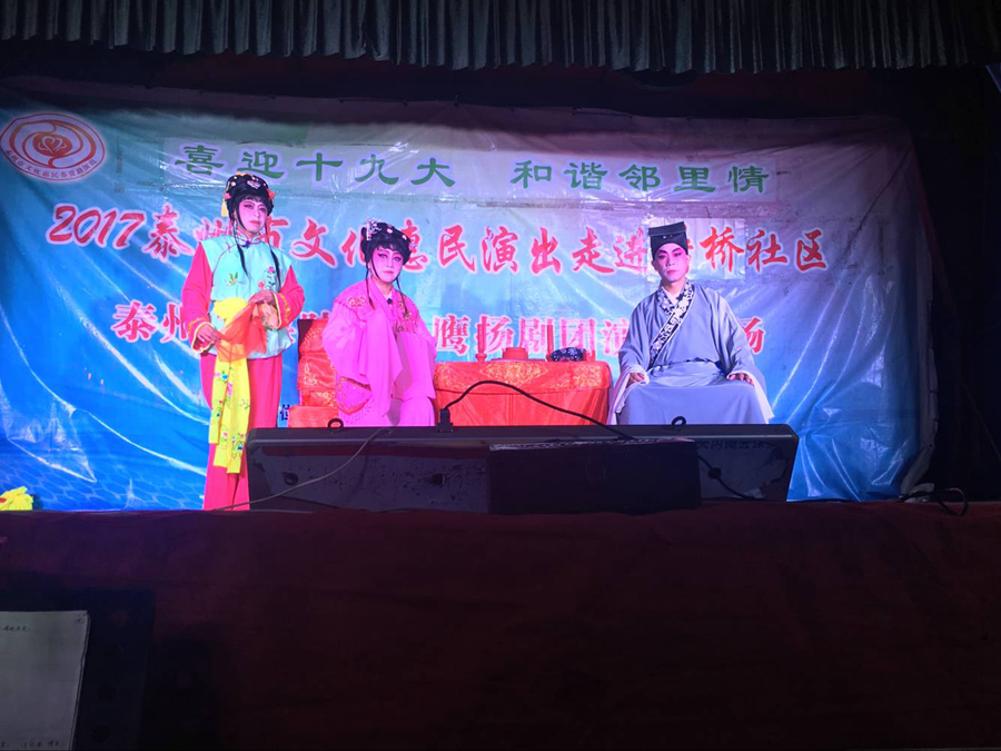 2017泰州市文化惠民演出走进医药高新区寺巷街道屠桥社区,海陵区小鹰扬剧团专场演出,于9月15日晚上在泰州医药高新区寺巷街道屠桥社区幼儿园门口广场成功举办。本次演出剧目为传统扬剧《珍珠塔》,剧中姑妈妈的势利,嫌贫爱富的举动受到观众的谴责,剧情大义就是告诉世人,人穷不能穷一辈子,三十年河东转河西,姑妈嫌她侄儿方卿穷,上门来投亲,都不相认,并且说了好多刺激他的话,说他没有高官做,方卿后来励志苦读三年书,考举了头名状元,唱道情羞辱他的姑妈,让她改掉势利的坏习惯。演员们精彩的演出,博得了观众的阵阵掌声。演出很成功!感谢社区领导提供全方位的服务!