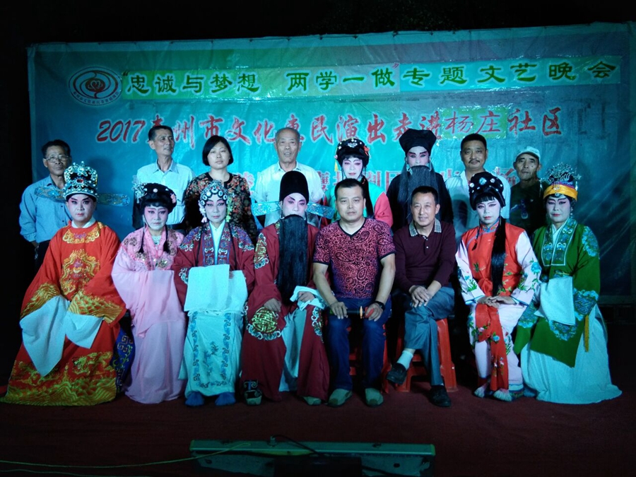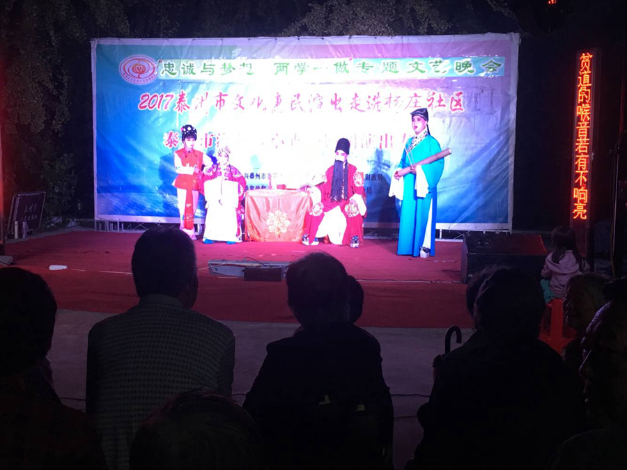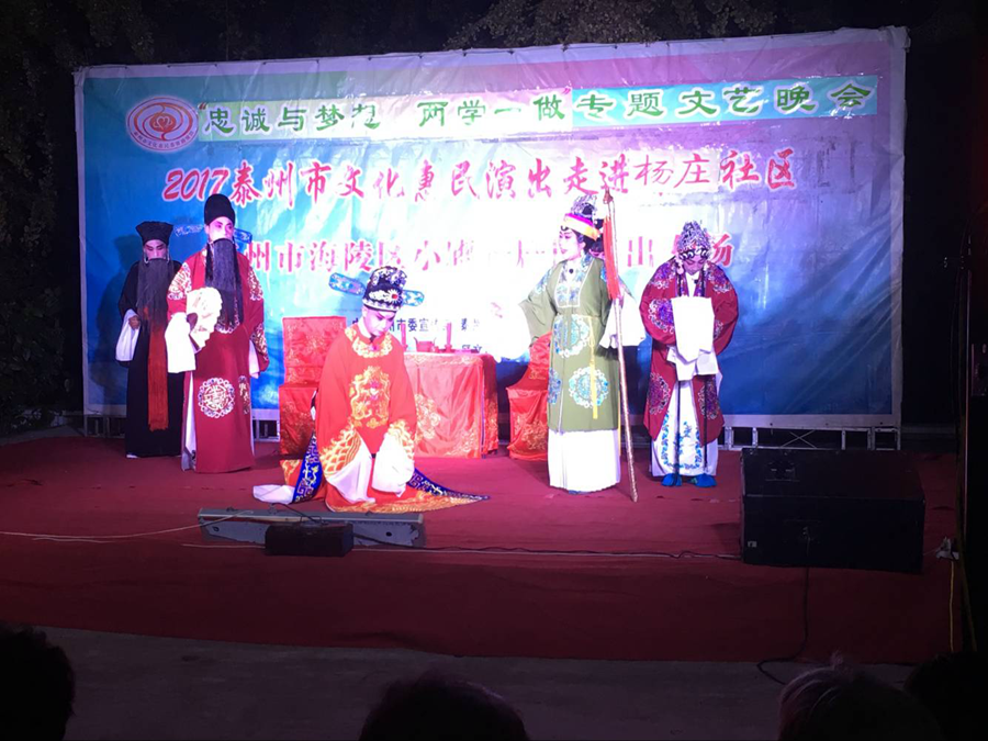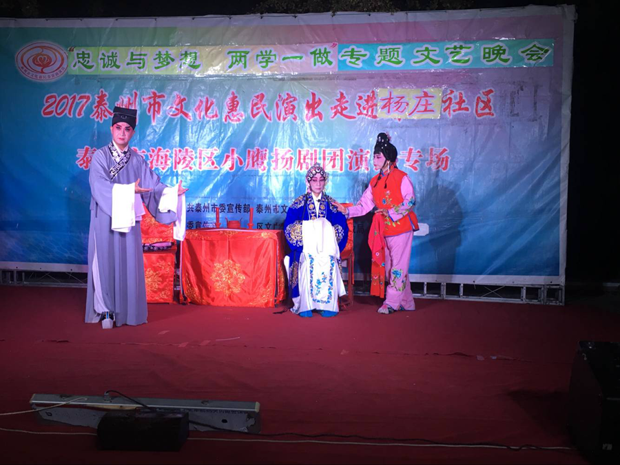 2017泰州市文化惠民演出走进医药高新区凤凰街道杨庄社区,海陵区小鹰扬剧团专场演出,于9月19日晚上在医药高新区凤凰街道杨庄社区百姓大舞台成功举办。本场演出剧目为大型扬剧《分裙记》,此剧剧情跌宕起伏,曲折动人,最终坏人得到了应有的下场,演员们精彩的表演赢得了观众的阵阵掌声。演出很成功!最后应观众要求又加演了扬剧折子戏。感谢社区领导提供全方位的服务!