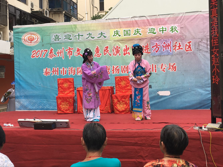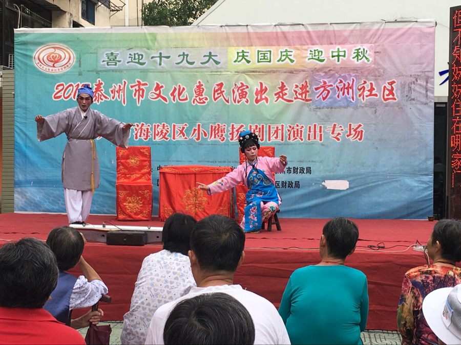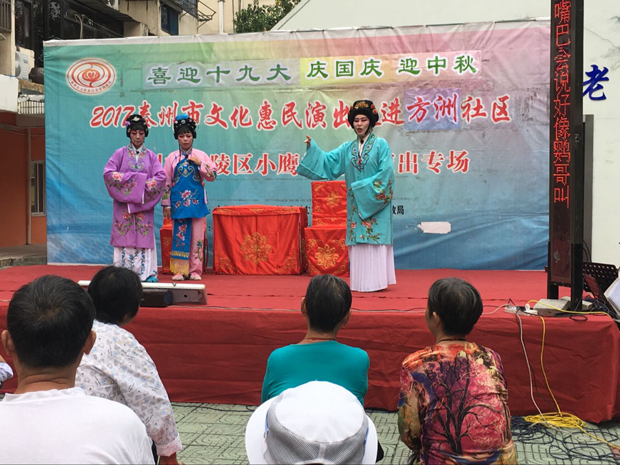 2017泰州市文化惠民演出走进海陵区城中街道方洲社区,海陵区小鹰扬剧团专场演出,2017年9月21日下午在海陵区城中街道方洲社区海阳居家养老中心院内广场成功举办。本场演出剧目为扬剧《小媳妇回娘家》及《安寿宝卖身》选段,演员们精彩的表演博得了观众的阵阵掌声。演出很成功!感谢社区领导提供全方位的服务!