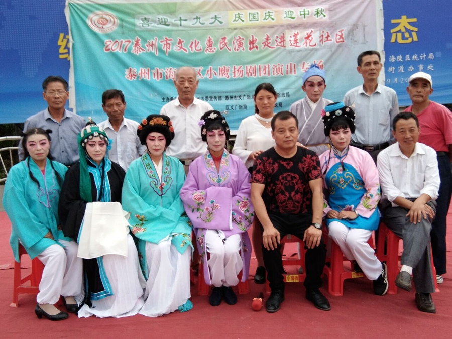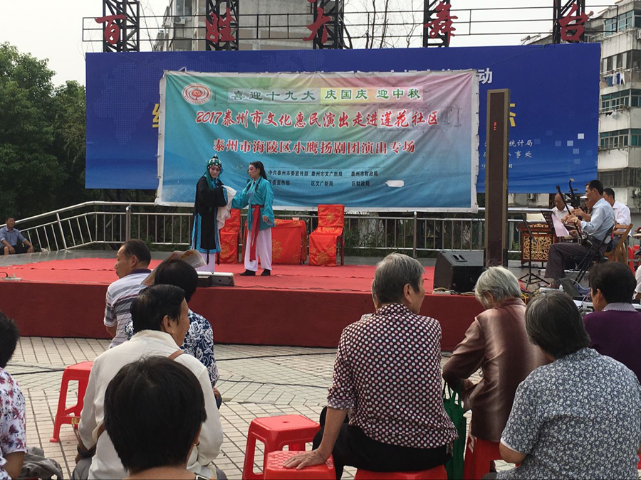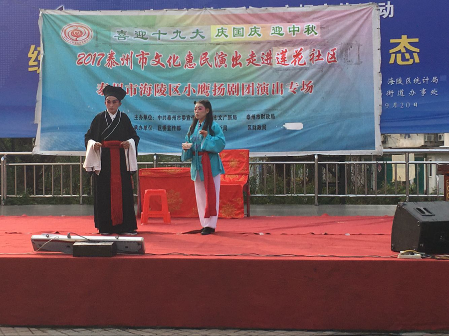 2017泰州市文化惠民演出走进海陵区城南街道莲花社区,海陵区小鹰扬剧团专场演出,2017年9月25日下午在海陵区城南街道莲花社区百姓大舞台成功举办。本场演出演出剧目为现代滑稽扬剧《小媳妇回娘家》以及传统扬剧《安寿宝》卖身选段,演员们精彩的表演博得了观众的阵阵掌声。演出很成功!感谢社区领导提供全方位的服务!