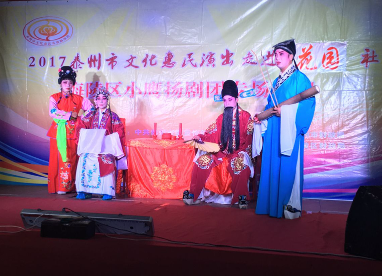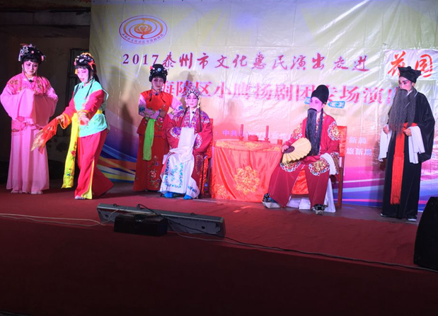 泰州市2017文化惠民演出走进海陵区城北街道花园社区,海陵区小鹰扬剧团专场演出,2017年9月26日晚上在泰州市海陵区城北街道花园社区广场成功举办。本次演出剧目为传统扬剧《珍珠塔》,剧中姑妈妈的势利,嫌贫爱富的举动受到观众的谴责,剧情大义就是告诉世人,人穷不能穷一辈子,三十年河东转河西,姑妈嫌她侄儿方卿穷,上门来投亲,都不相认,并且说了好多刺激他的话,说他没有高官做,方卿后来励志苦读三年书,考举了头名状元,唱道情羞辱他的姑妈,让她改掉势利的坏习惯。演员们精彩的演出,博得了观众的阵阵掌声。演出很成功!感谢社区领导提供全方位的服务!