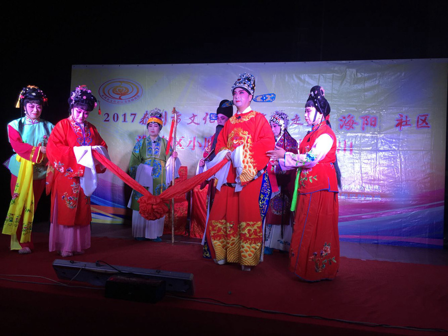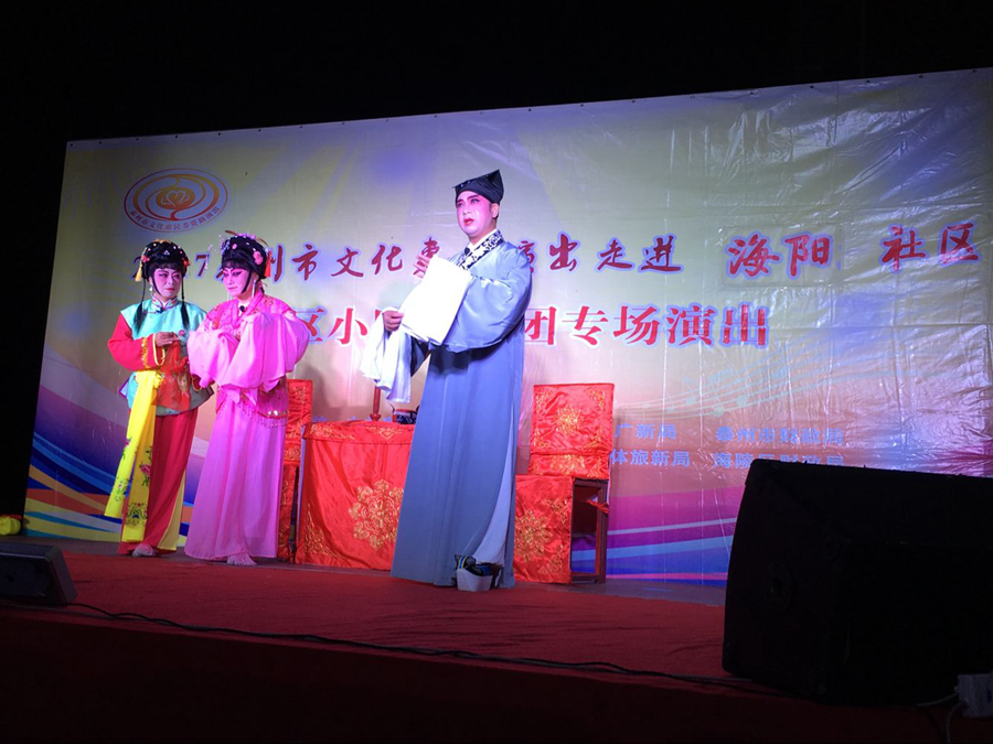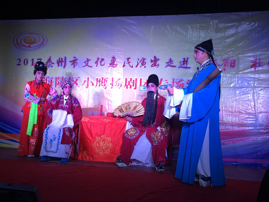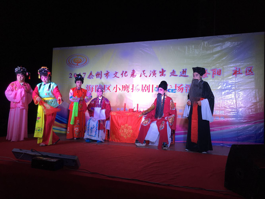 泰州市2017文化惠民演出走进海陵区城西街道海阳社区,海陵区小鹰扬剧团专场演出,2017年9月27日晚上在泰州市海陵区城西街道海阳社区西域绿洲广场成功举办。本次演出剧目为传统扬剧《珍珠塔》,剧中姑妈妈的势利,嫌贫爱富的举动受到观众的谴责,剧情大义就是告诉世人,人穷不能穷一辈子,三十年河东转河西,姑妈嫌她侄儿方卿穷,上门来投亲,都不相认,并且说了好多刺激他的话,说他没有高官做,方卿后来励志苦读三年书,考举了头名状元,唱道情羞辱他的姑妈,让她改掉势利的坏习惯。演员们精彩的演出,博得了观众的阵阵掌声。演出很成功!感谢社区领导提供全方位的服务!
