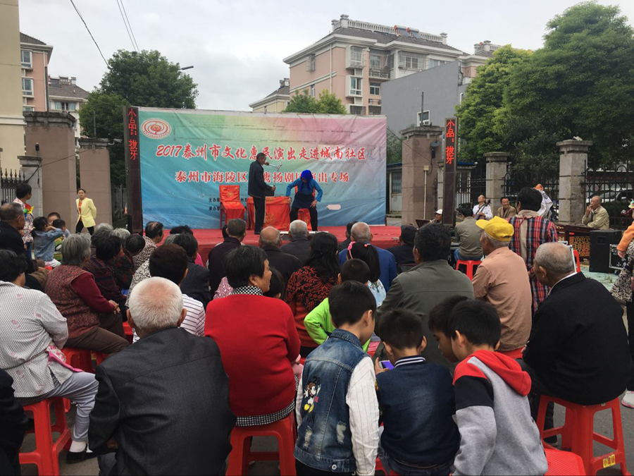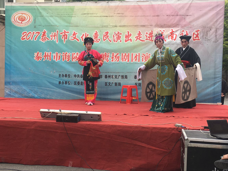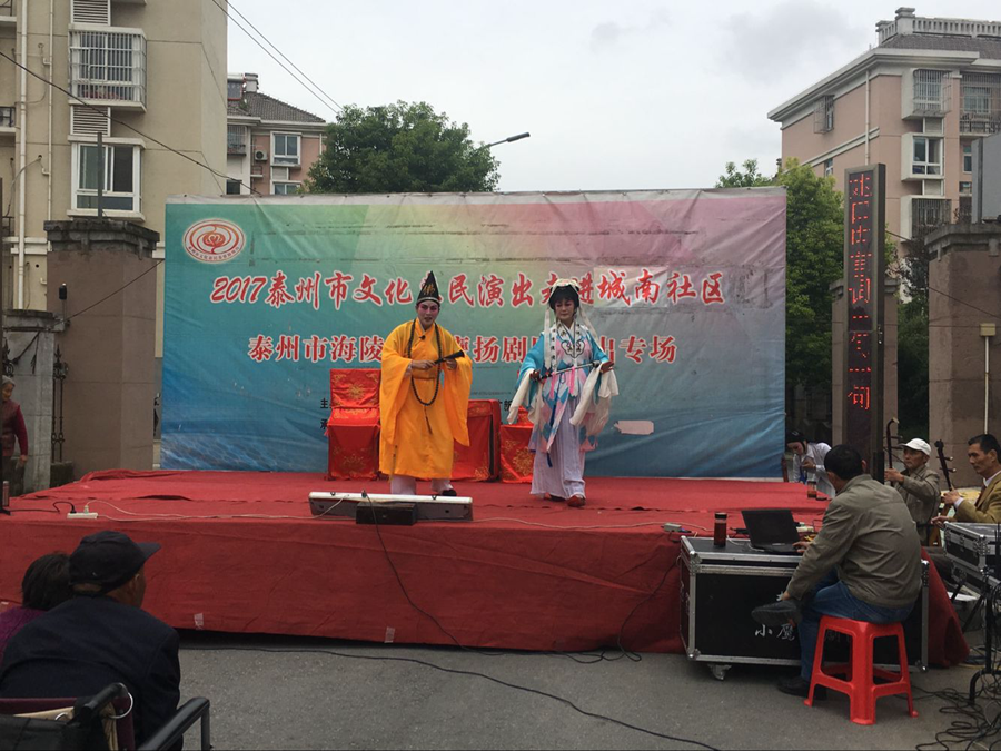 2017泰州市文化惠民演出走进城南社区,海陵区小鹰扬剧团专场演出,于2017年10月3日下午在泰州医药高新区明珠街道城南社区成功举办。本场演出演出剧目为扬剧折子戏《探寒窑》和《僧尼下山》。扬剧《僧尼下山》是扬剧表演艺术家杨国斌和高派传人祝荣娟老师合作演出的拿手戏,至今是百听不厌,演员们精彩的表演博得了观众的阵阵掌声。小品方言拔牙让观众捧腹大笑,演出很成功!感谢社区领导提供全方位的服务!