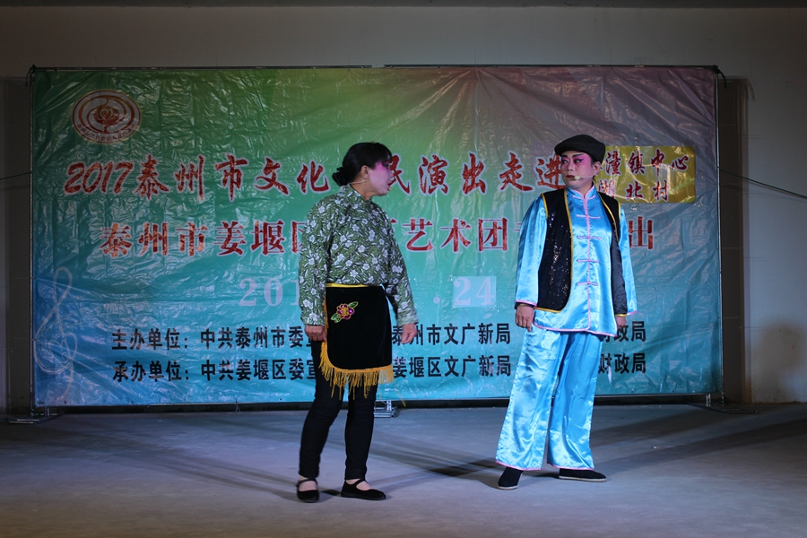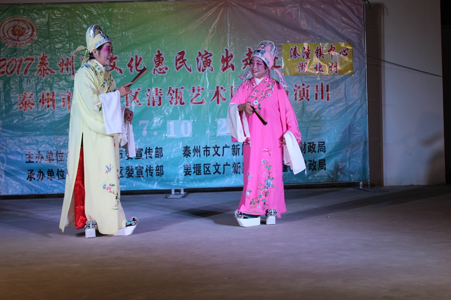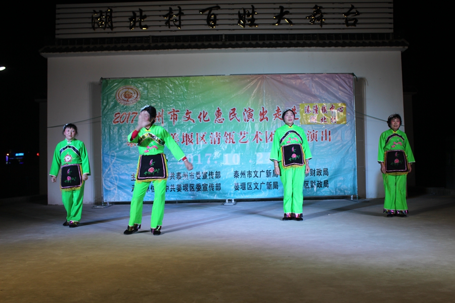十月二十四曰,姜堰区清瓴艺术团恵民演出走进溱潼镇中心,演出在湖北村大舞台举行.演出有歌舞,小戏剧,情景剧,小品.表演唱等多种形式.演出过程中观众掌声不断,热情高涨.整台演出近两个小时.受到了大家的一致好评.