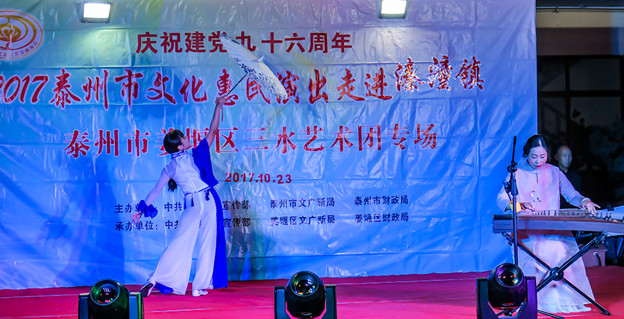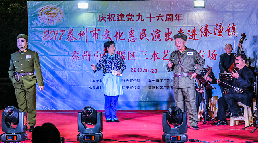 金秋送爽丹桂飘香,在庆祝党的十九大胜利召开的喜庆日子里,姜堰区三水艺术团应水乡人民的盛情相邀,于十月二十三日晚来到古镇溱潼进行惠民演出。给广大群众送来了一台精彩的文艺演出,为党的十九大召开营造浓烈的节日氛围。