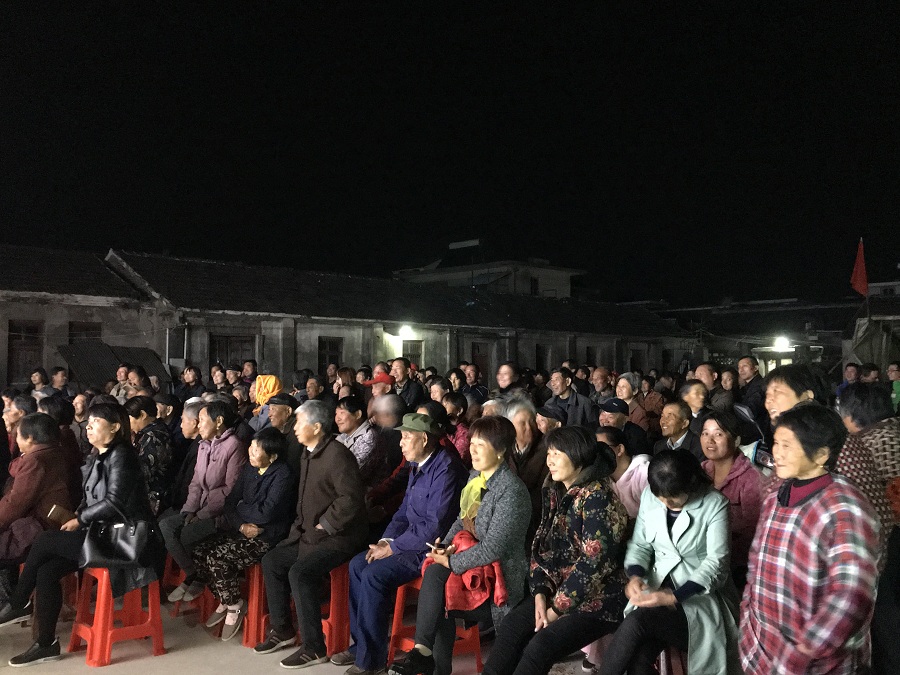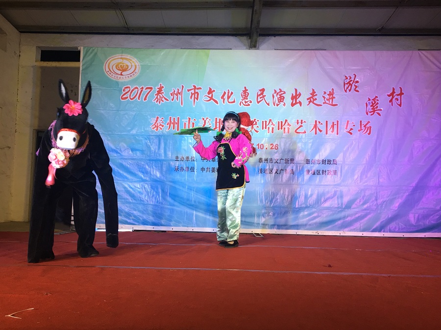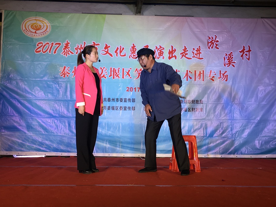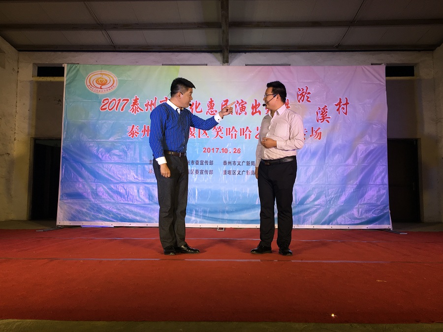 10月26日,姜堰区笑哈哈艺术团文化惠民专场演出走进淤溪村。晚上7点演出在淤溪村大舞台准时开始,现场表演的节目有舞蹈《红红火火大中华》、莲花落说唱《莲花一打笑哈哈》、方言韵白《路在脚下》、《拐过弯来是幸福》相声《趣说姜堰话》萨克斯演奏《北国之春》、表演《回娘家》、天津快板《有话好好说》、表演唱《财政惠民乐农家》、以及独唱等11种形式、12个节目。整台演出时长120分钟,观众约800人左右。节目形式多样、内容丰富,尤其相声、快板、喜剧小品、方言韵白等语言类特色节目赢得了观众的阵阵笑声和掌声,受到村干部、群众的一致好评。
