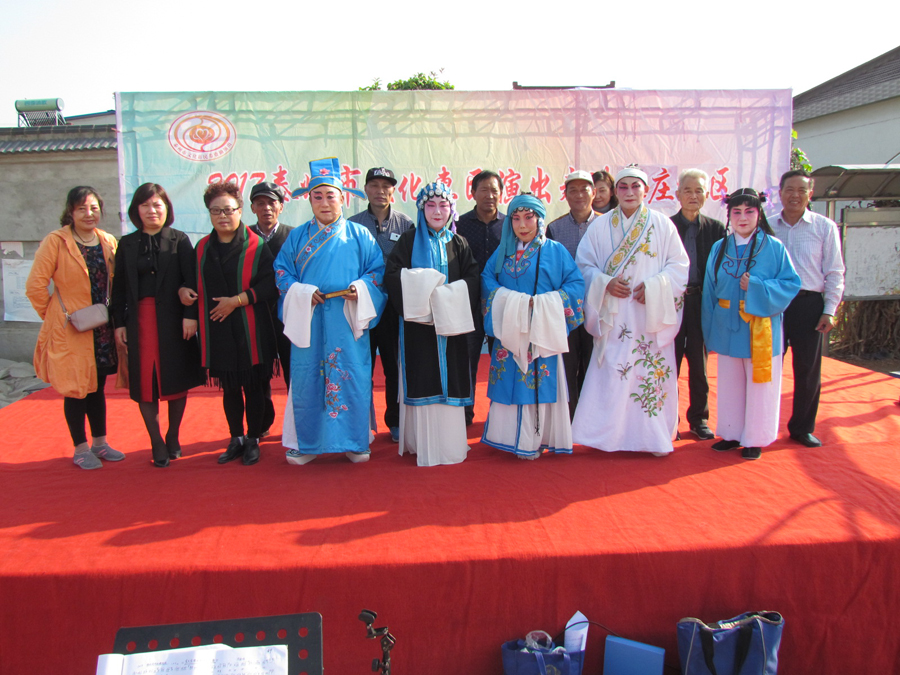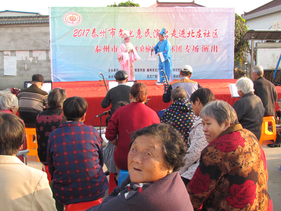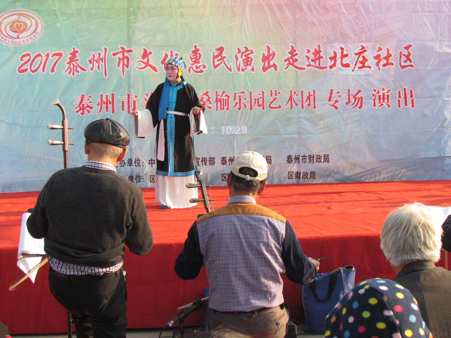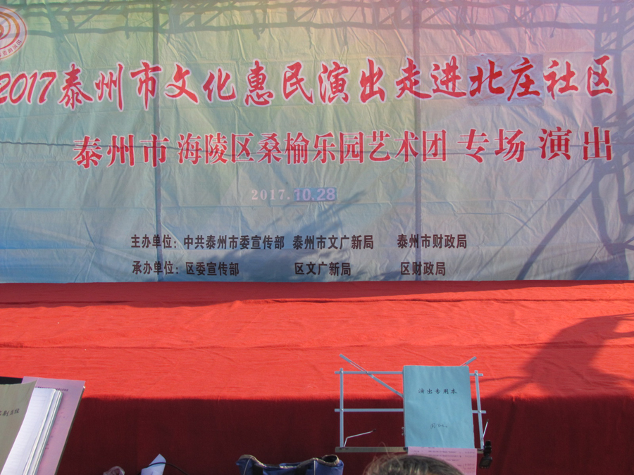 2017年10月28日下午,多云天气,秋高气爽,气候宜人。在新通扬运河南岸的苏陈镇北庄村的广场上,海陵区桑榆乐园艺术团为北庄村的父老乡亲们送去了一台精彩的戏曲专场演出,有淮剧《赵五娘》折子戏选段“别家”,有扬剧《安寿宝卖身》折子戏选段“破 庙失子”以及扬淮折子戏选段“十八相送”等,近200名群众对每个节目都报以热烈的掌声,有的节目演出后,群众还要求再来一个,艺术团都一一满足群众的需求。精彩的演出在苏陈镇北端,新通扬运河畔形成了一道亮丽的风景线。