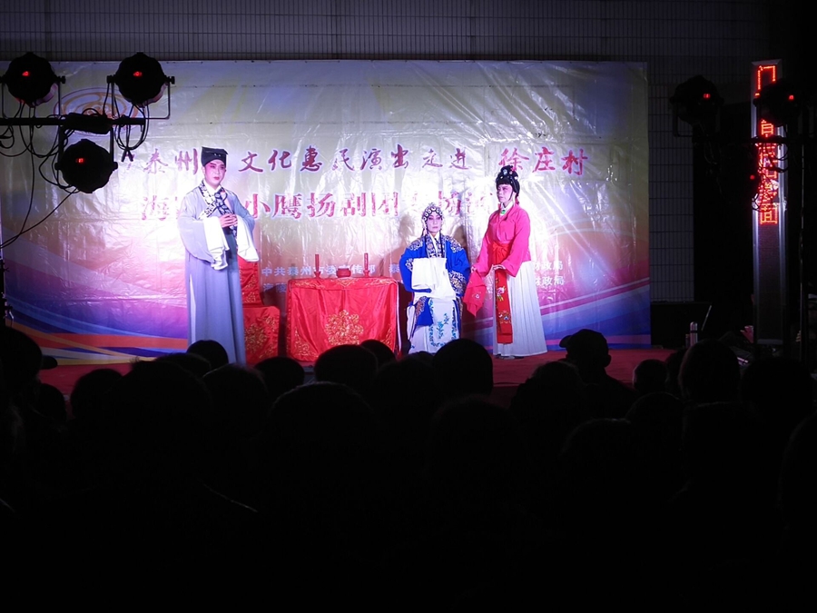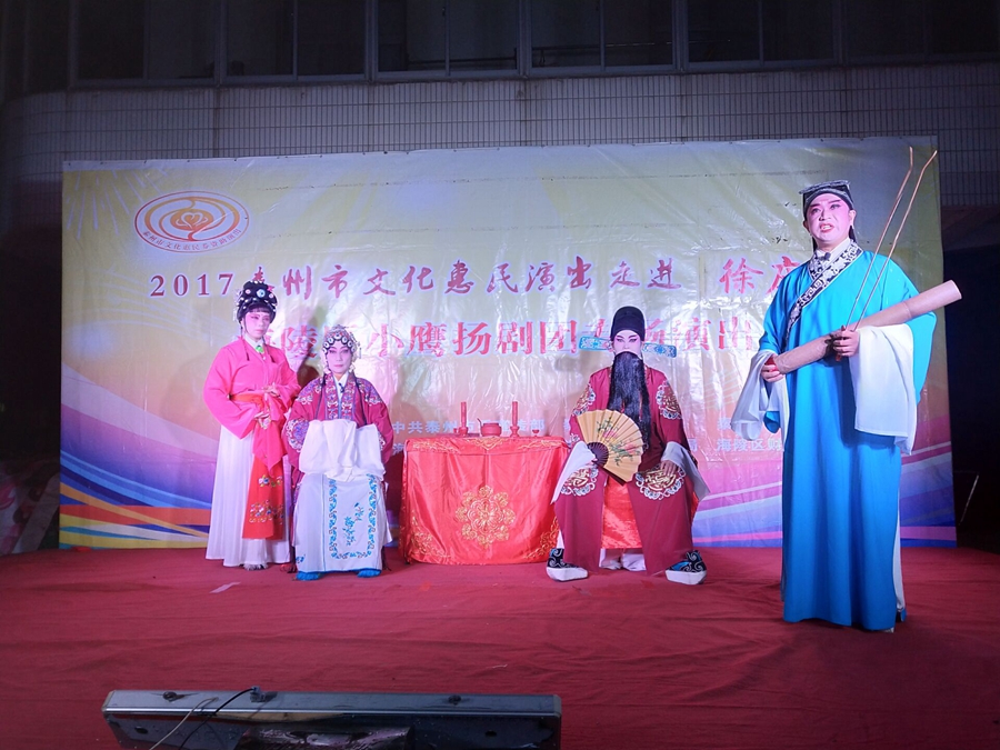 泰州市2017文化惠民演出走进海陵区苏陈镇徐庄村,海陵区小鹰扬剧团专场演出,2017年10月29日晚上在徐庄村七组广场成功举办。本次演出剧目为传统扬剧《珍珠塔》,剧中姑妈妈的势利,嫌贫爱富的举动受到观众的谴责,剧情大义就是告诉世人,人穷不能穷一辈子,三十年河东转河西,姑妈嫌她侄儿方卿穷,上门来投亲,都不相认,并且说了好多刺激他的话,说他没有高官做,方卿后来励志苦读三年书,考举了头名状元,唱道情羞辱他的姑妈,让她改掉势利的坏习惯。演员们精彩的演出,博得了观众的阵阵掌声。演出很成功!感谢社区领导提供全方位的服务!成功举办。