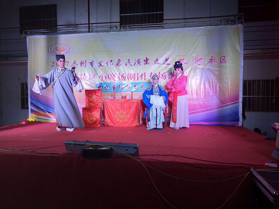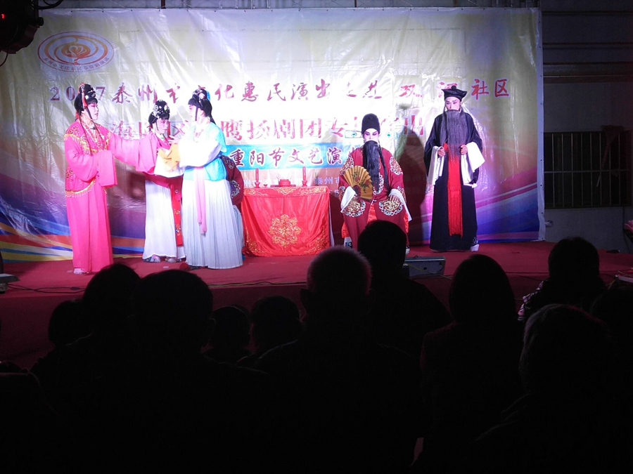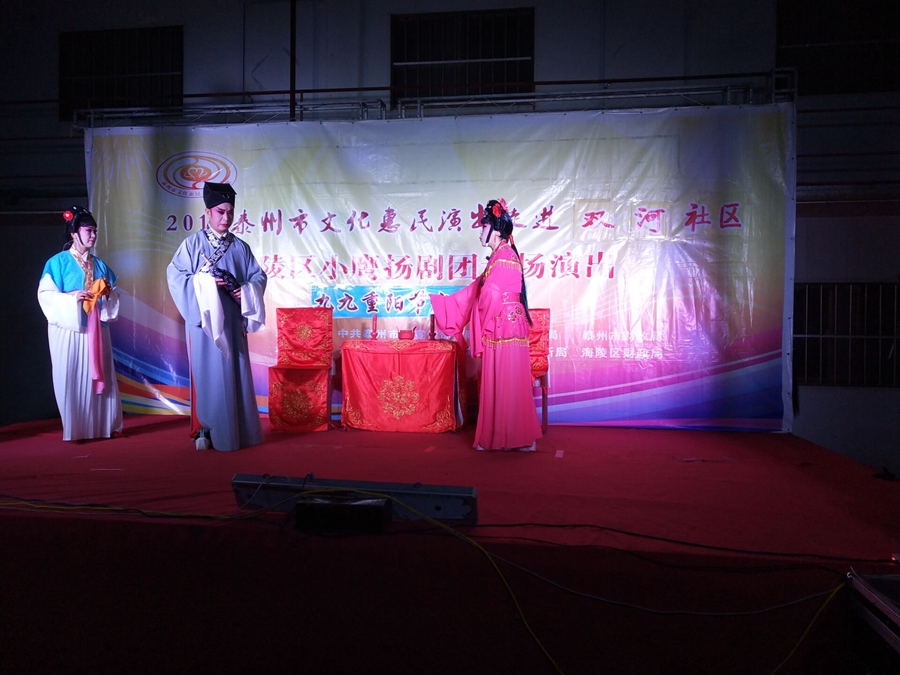 2017泰州市文化惠民演出走进凤凰街道双河社区小鹰扬剧团专场演出,于10月28日晚上在双河社区成功举办。本次演出剧目为传统扬剧《珍珠塔》,剧中姑妈妈的势利,嫌贫爱富的举动受到观众的谴责,剧情大义就是告诉世人,人穷不能穷一辈子,三十年河东转河西,姑妈嫌她侄儿方卿穷,上门来投亲,都不相认,并且说了好多刺激他的话,说他没有高官做,方卿后来励志苦读三年书,考举了头名状元,唱道情羞辱他的姑妈,让她改掉势利的坏习惯。演员们精彩的演出,博得了观众的阵阵掌声。最后又应观众要求加演了僧尼下山,演出很成功!感谢社区领导提供全方位的服务!