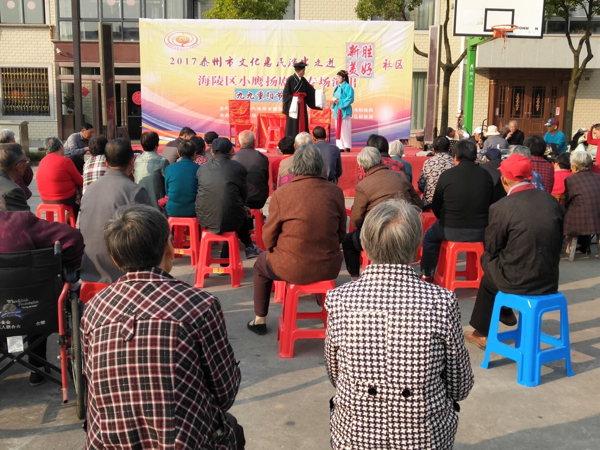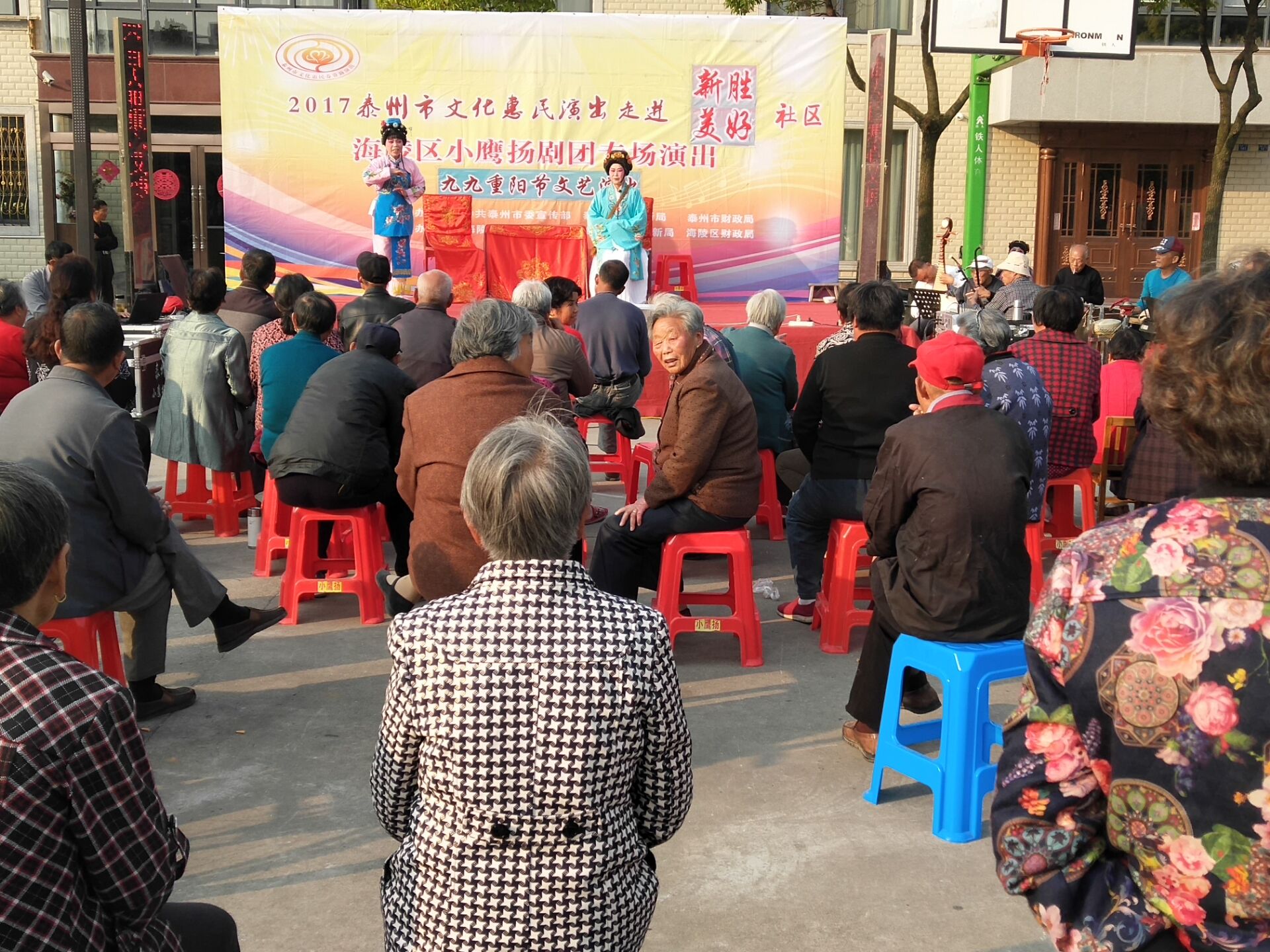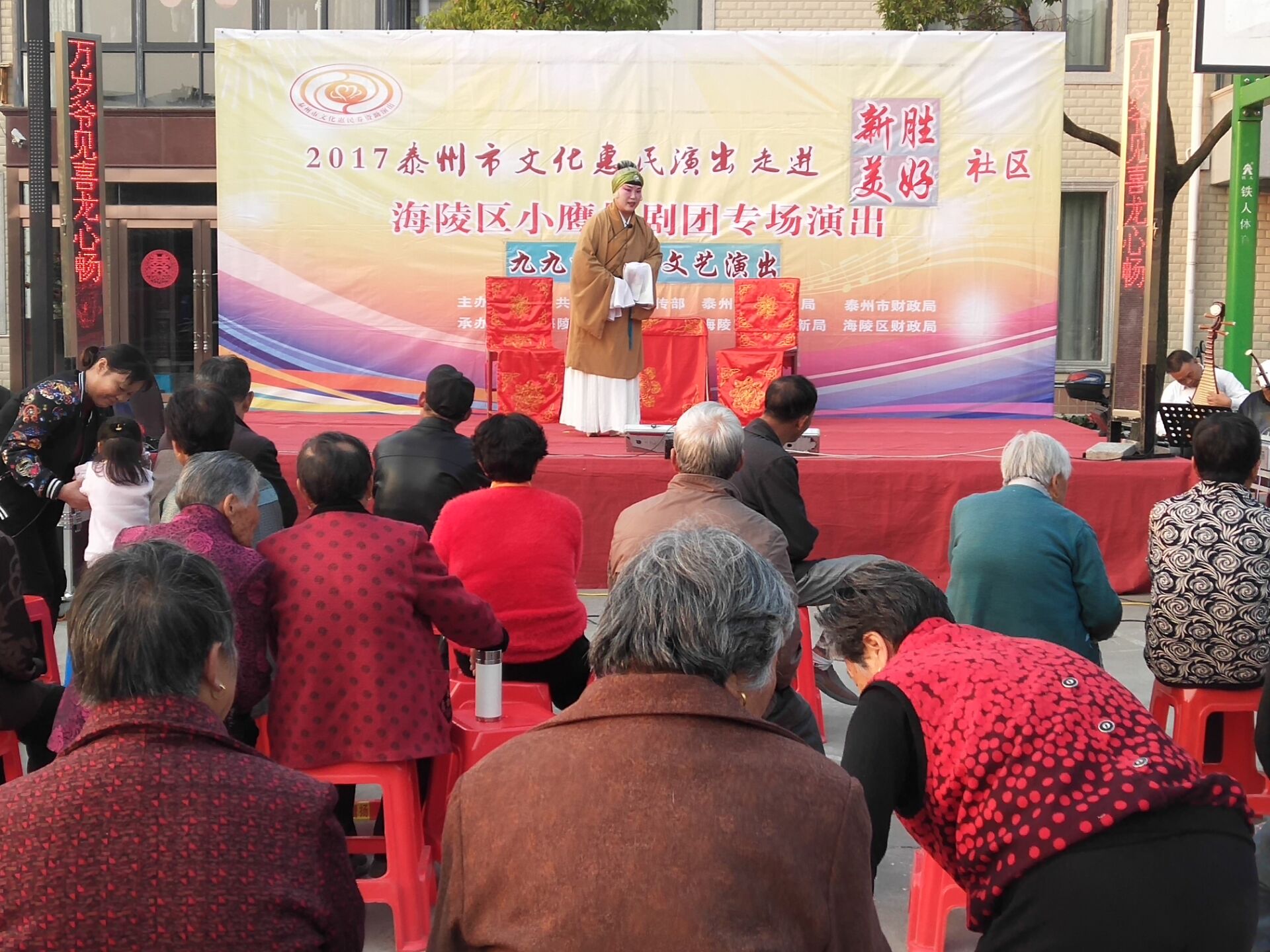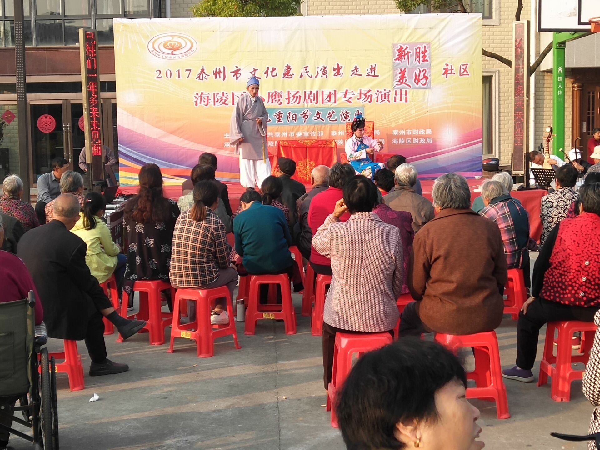 2017泰州市文化惠民演出走进海陵区城南街道新胜、美好社区,海陵区小鹰扬剧团专场演出,2017年10月27日下午在海陵区城南街道新胜社区百姓大舞台成功举办。本次活动演出剧目为扬剧折子戏《安寿宝卖身》-卖身选段、现代滑稽扬剧《小媳妇回娘家》。经典的扬剧折子戏博得了观众的阵阵掌声。演出结束应观众要求又加演了《断太后》选段-恨刘妃。演出很成功!感谢社区领导提供全方位的服务!