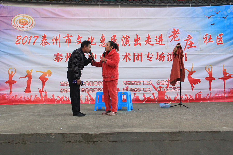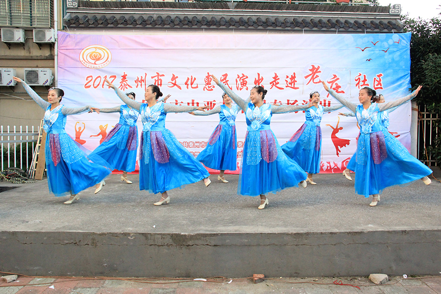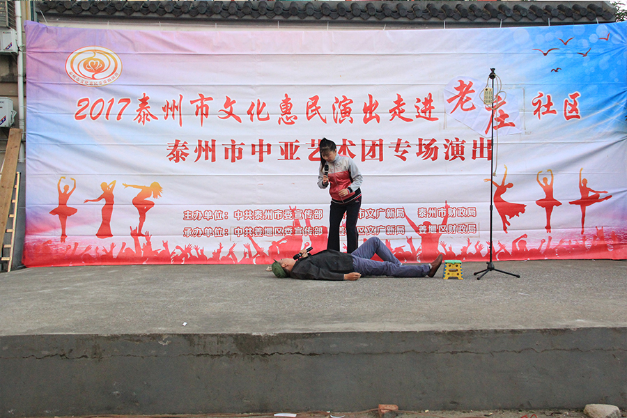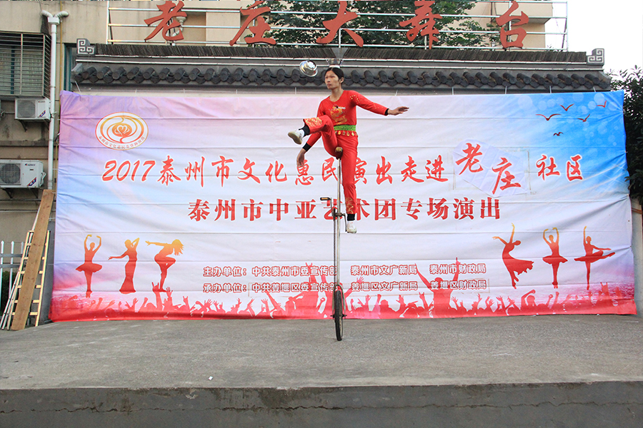 2017泰州市文化惠民演出走进姜堰区老庄社区,中亚艺术团专场演出,2017年10月24日下午在泰州市姜堰区老庄成功举办。本场演出剧目为大型舞蹈、搞笑小品、高难度杂技,好听的歌伴舞等演员们精彩的表演唱博得了观众的阵阵掌声。演出很成功!最后获得广大民众的一致好评,也感谢社区领导提供全方位的服务!