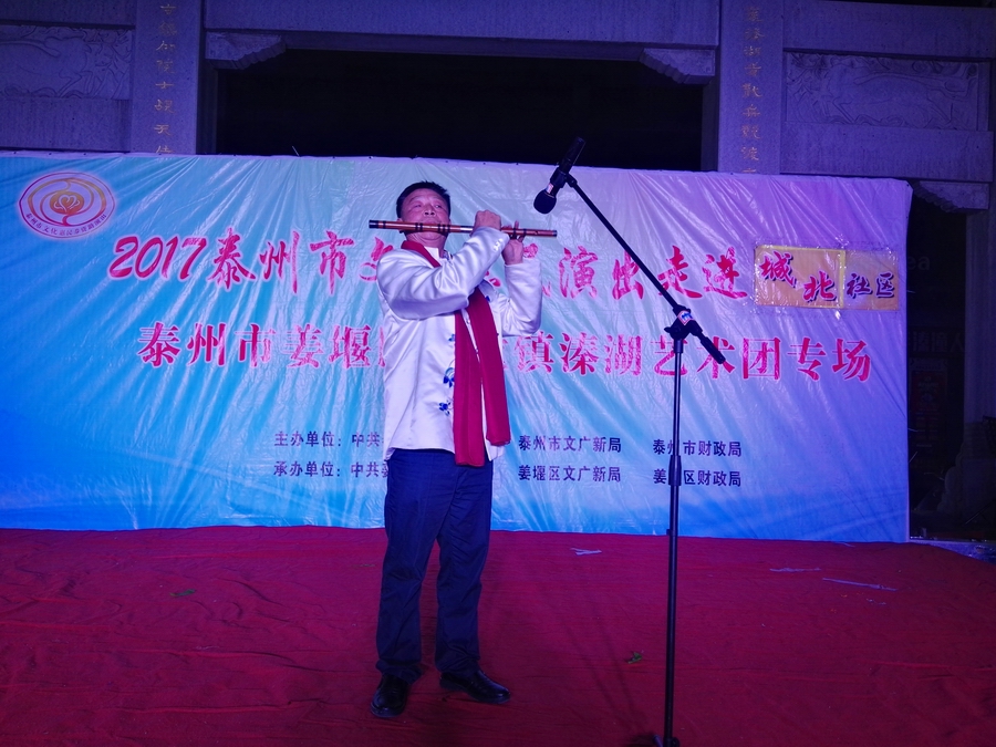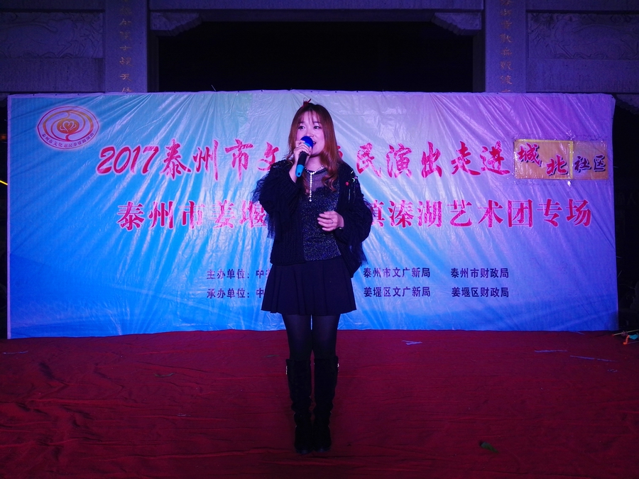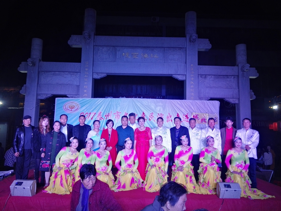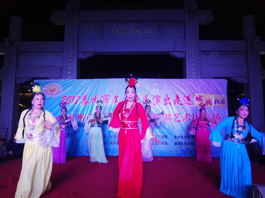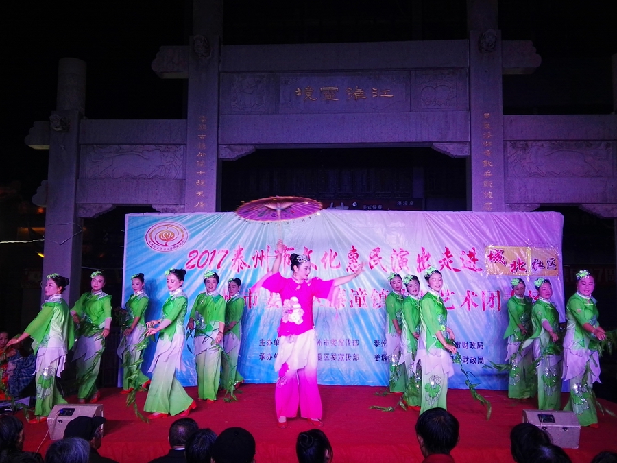 11月2日,秋高气爽姜堰区溱潼镇溱湖艺术团受溱潼镇文化站邀请,2017年泰州市文化惠民券专场演出于当天晚上6点30分,在钟楼广场上演。为适应观众不同层次的文化欣赏需求,溱湖艺术团精心策划了14个丰富多彩的文艺节目,随着悠扬的音乐响起,舞蹈《古镇秀溱湖美》拉开了演出序幕,当晚演出不仅有激情奔放的民歌与民舞,而且有耳熟能详的戏曲,淮剧《手捧枝头花香藕》,最后在歌伴舞《阳光路上》结束演出,整台演出效果好,弘扬社会正气,倡导诚实守信,气氛热烈,掌声不断,赢得了广大观众的一致好评。当天晚上演出观众太热情了,不得不加演节目,时长120分钟,观众达到600多人,当天晚上虽然天气降温,观众人数多,我们演员认真演出,优美而精彩的表演,给居民送去一份丰盛的文化大餐。
