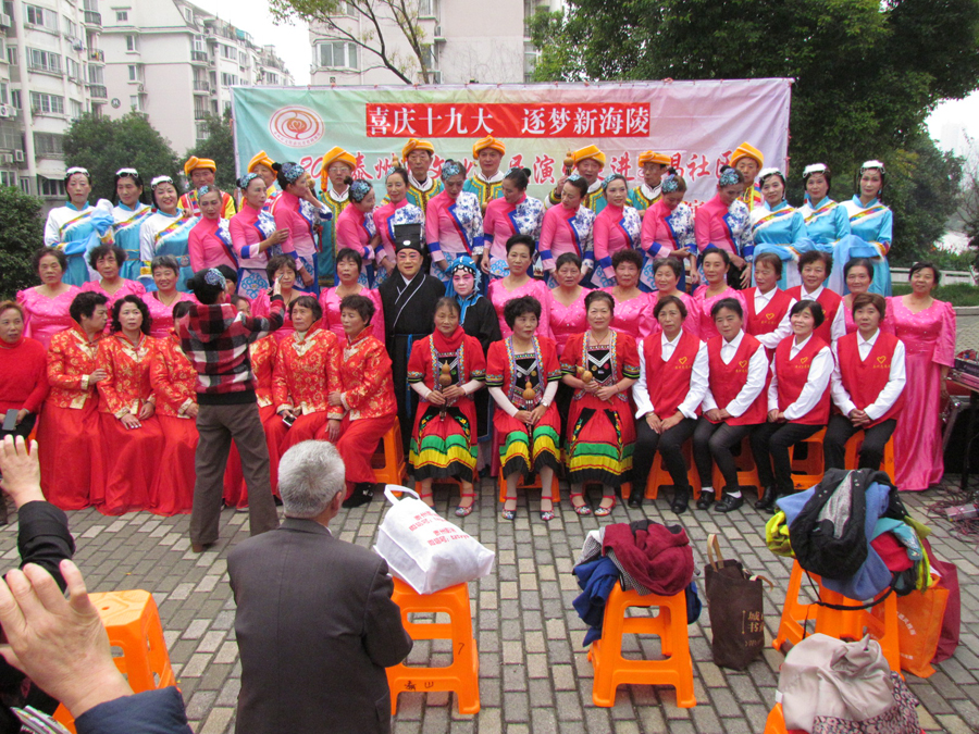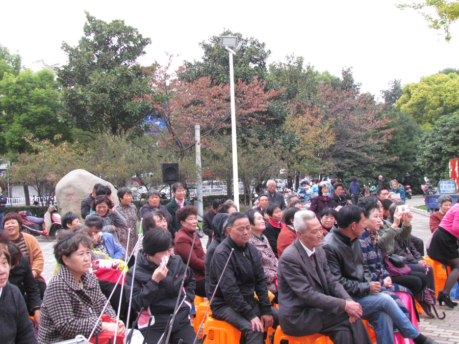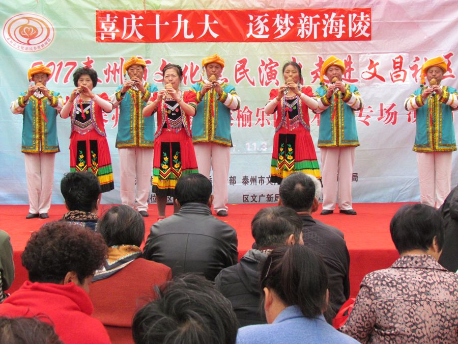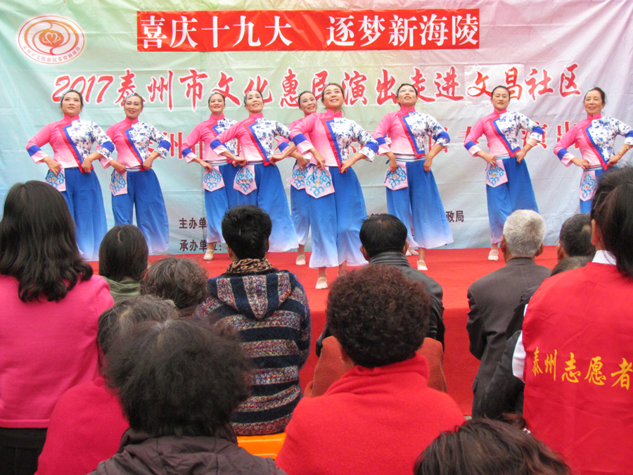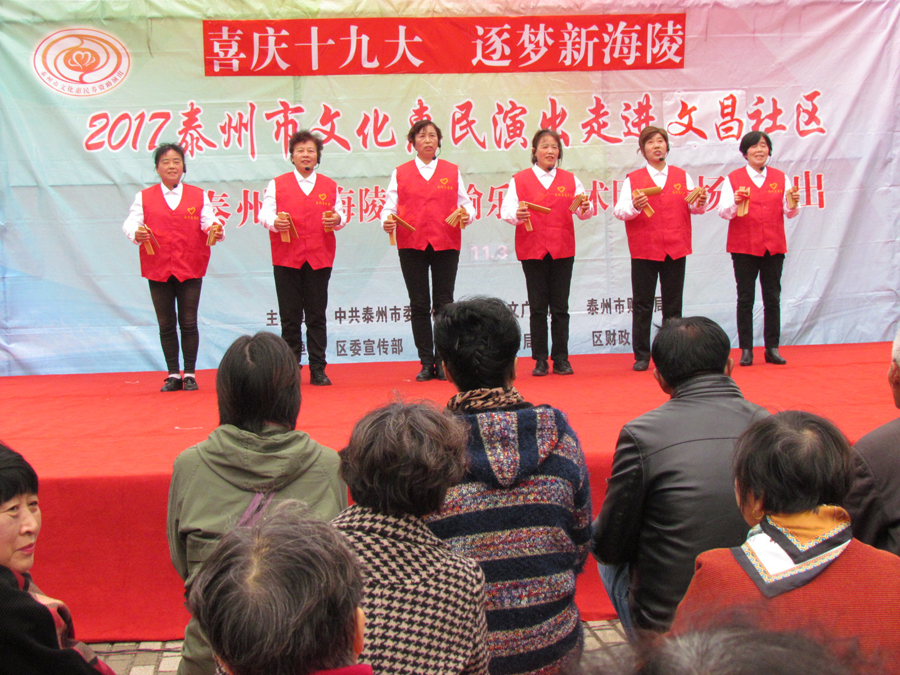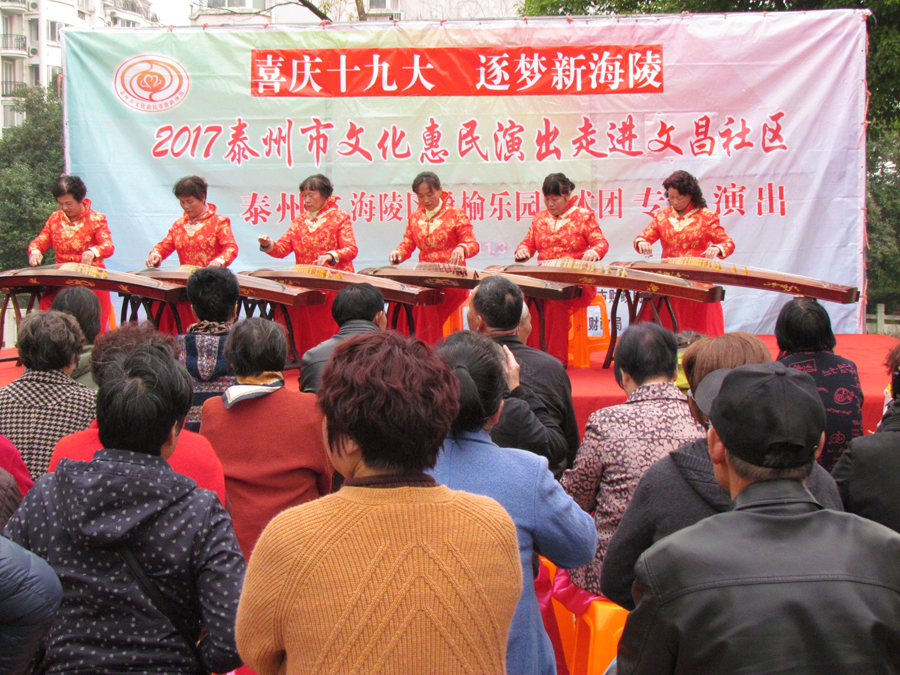 2017年11月3日下午,多云天气,秋高气爽,气候宜人,在海陵区南城河畔,文昌阁北侧文昌社区广场上,海陵区桑榆乐园艺术团为文昌社区的父老乡亲们送去了一台精彩的综合性文艺演出。有古筝演奏、快板、舞蹈、合唱、葫芦丝演奏,还有戏曲扬淮“十八相送”等等,200多名群众对每个节目都报以热烈的掌声,许多中、老年朋友竖起大拇指说“组织得好,演得好,唱得好。”精彩的演出在南城河北岸文昌阁旁与美丽的景色柔合成一道亮丽的风景线。