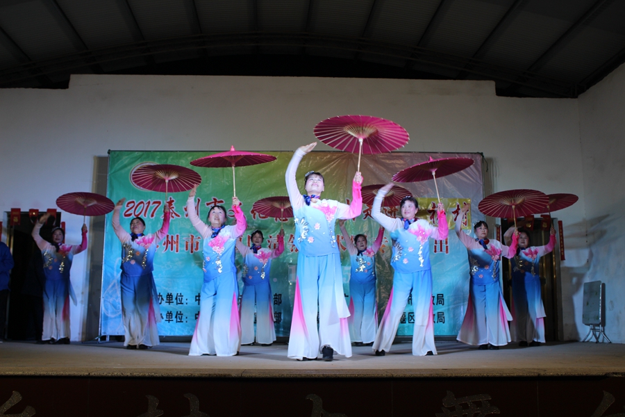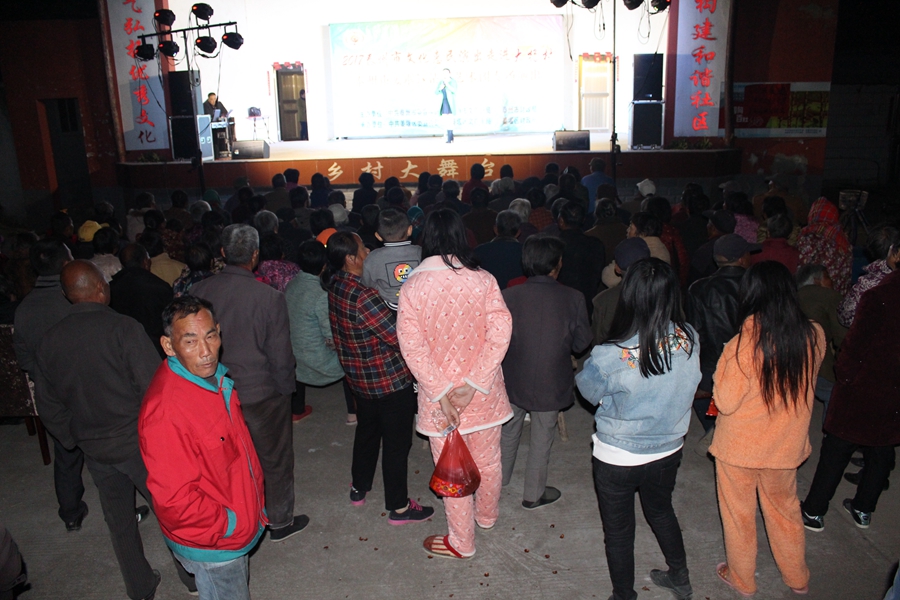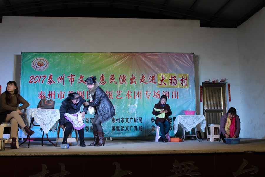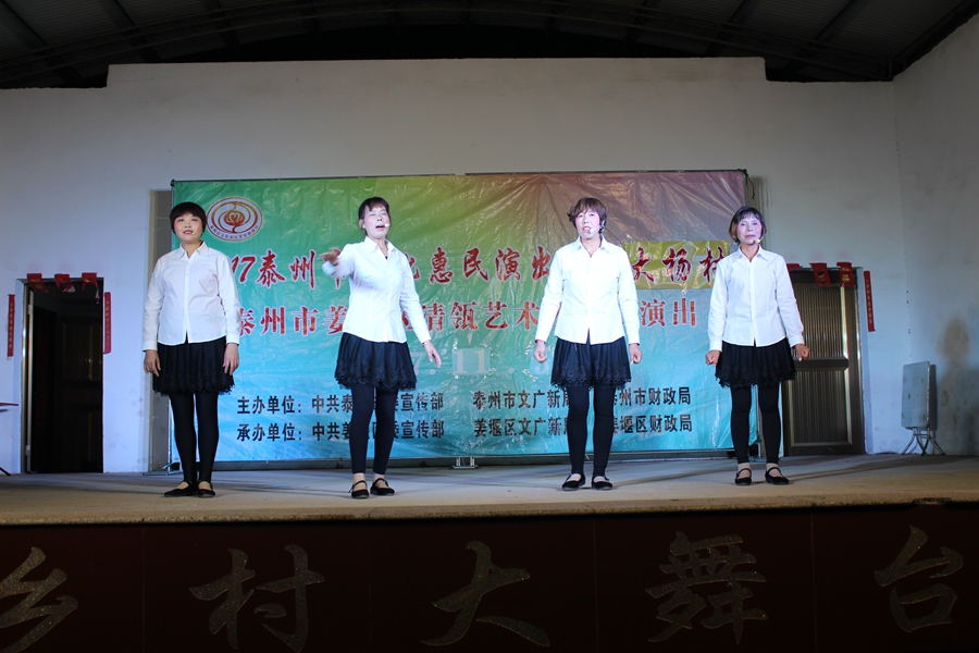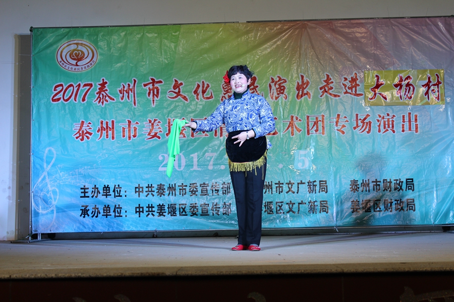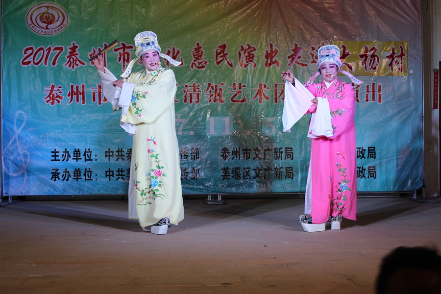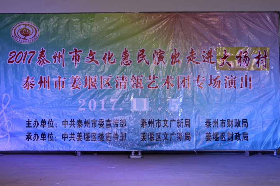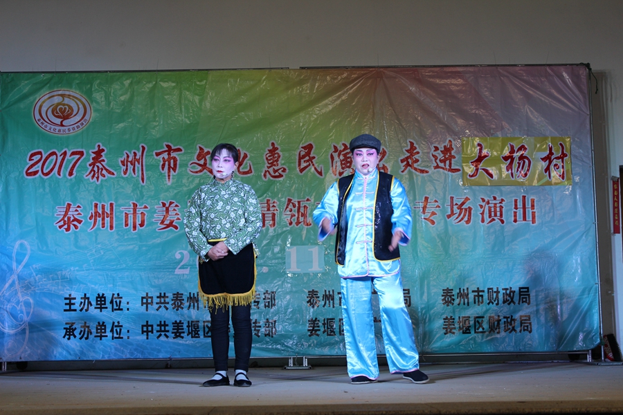 11月5日, 姜堰区清瓴艺术团恵民演出走进桥头镇大杨村,现场表演的节目形式有舞蹈.情景剧.表演唱.快板等.台上演员演得认真,台下观众掌声不断.方言韵白<<吵嘴>>赢得了观众的阵阵笑声和喝彩声,得到大杨村干部群众的一致好评.