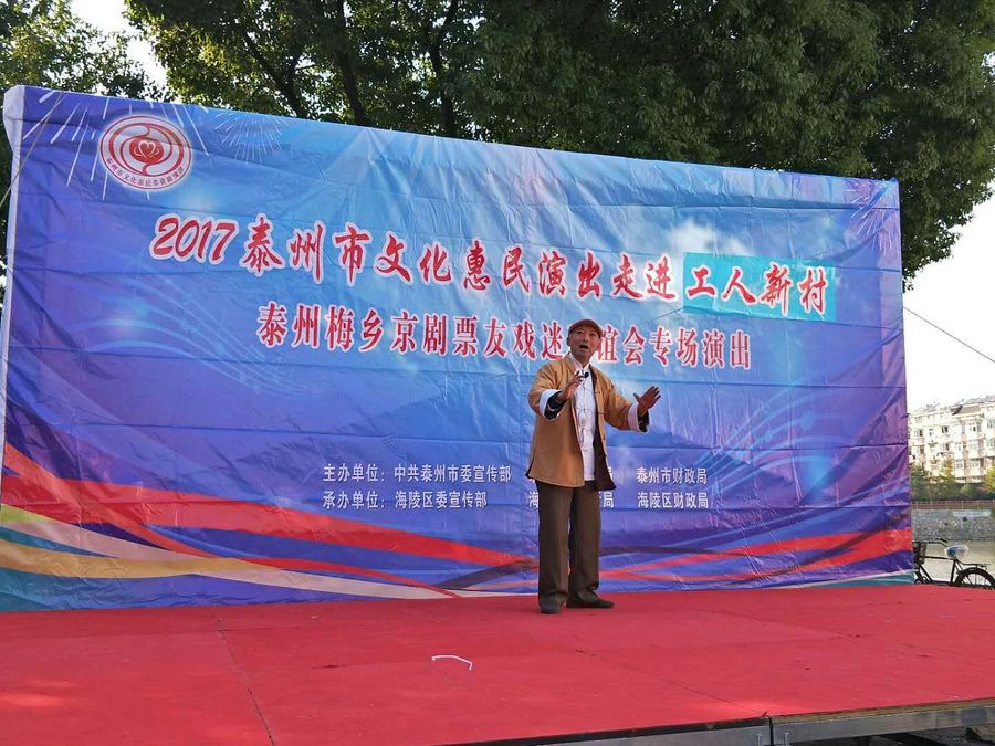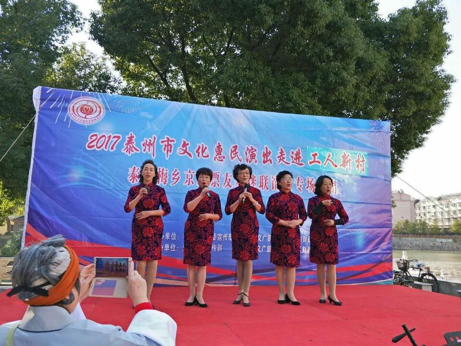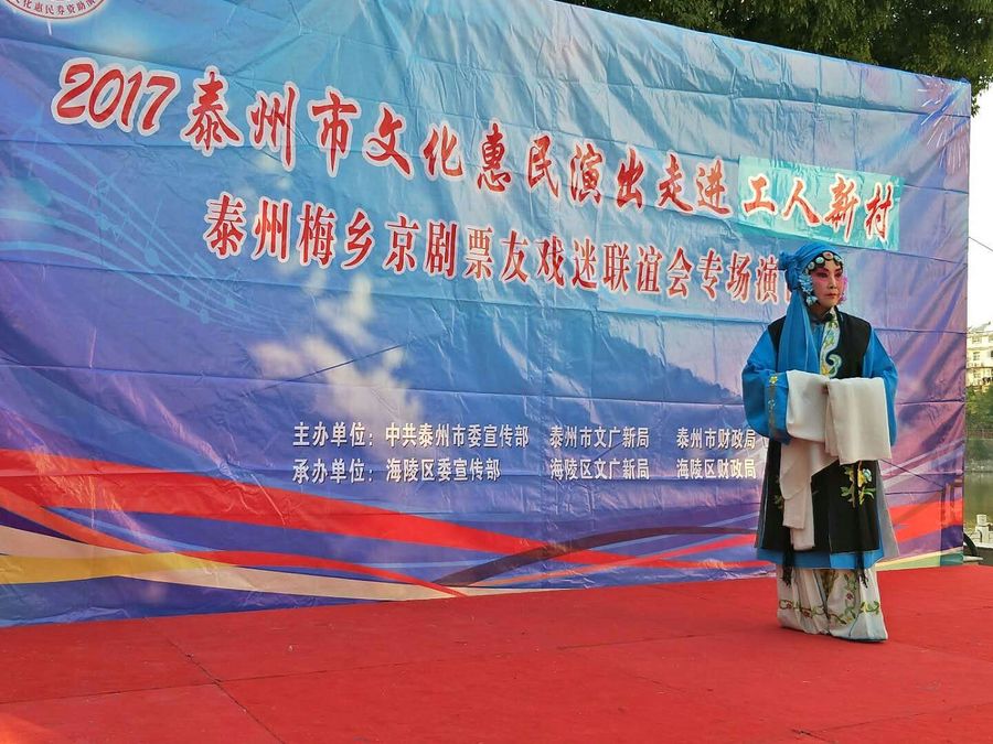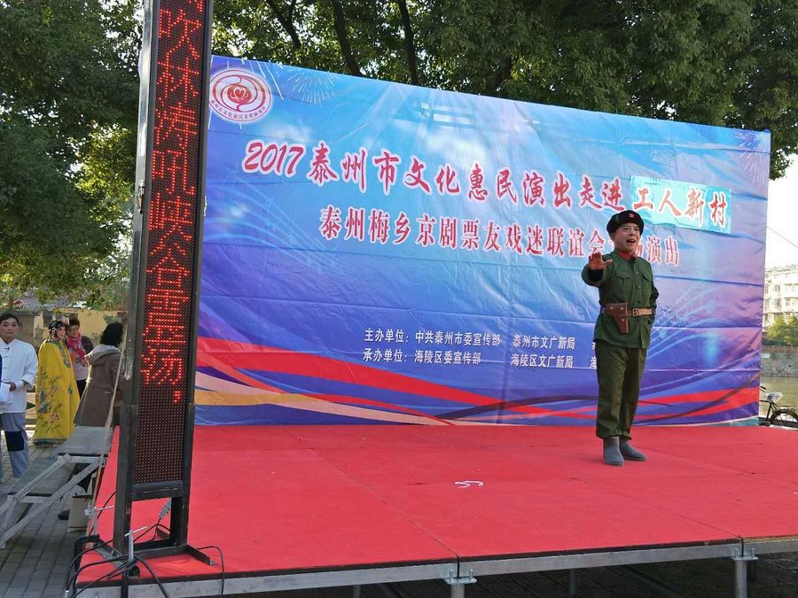 2017年11月5日下午,梅乡京剧票友联谊会赴城北街道工人社区,为居民们带去了一台京剧惠民演唱会。联谊会此次演出有现代京剧《智取威虎山》、《江姐》、《红灯记》、《海港》、《龙江颂》、《沙家浜》、《白毛女》等经典唱段,有传统京剧《诗文会》、《遇皇后》、《霸王别姬》、《锁麟囊》等传统名段,应广大观众朋友的要求,我们还短时间排练了一段扬淮对唱的《十八相送》,并成功参加了演出。整场演出受到广大市民朋友的热烈欢迎,台下观众的掌声、叫好声此起彼落,热心的观众相约我们再次相见,为他们送去更多更好的京剧名段。
