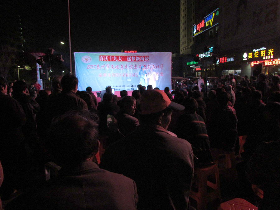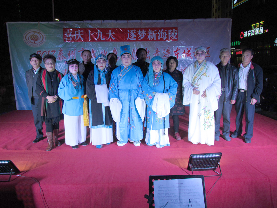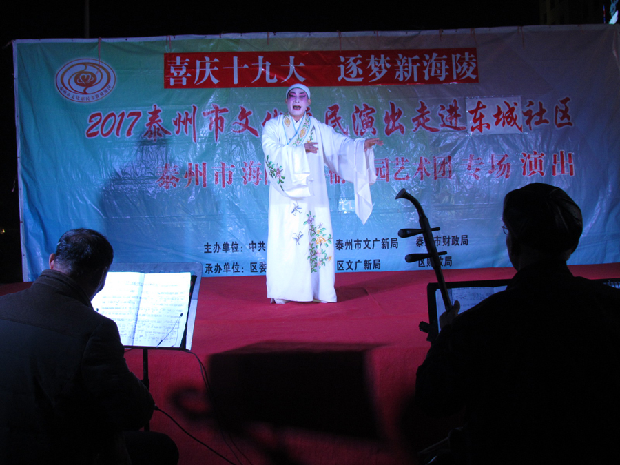 2017年11月7日晚18:30分,多云,初冬时节,气候宜人,在城东街道东城社区世纪联华超市广场,海陵区桑榆乐园艺术团为东城社区的父老乡亲们送去了一台精彩的戏曲专场演出,有淮剧《赵五娘》折子戏选段“别家”,有扬剧《安寿宝卖身》折子戏选段“破庙失子”以及扬淮折子戏选段“十八相送”等,近400名群众对每一个节目都报以热烈的掌声,有的节目演出后,群众还要求再来一段,艺术团都一一满足群众的要求,精彩的演出在东城一带形成了一道亮丽的风景线。