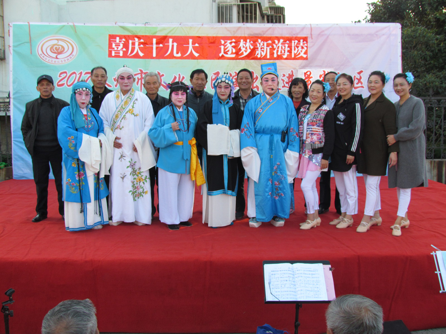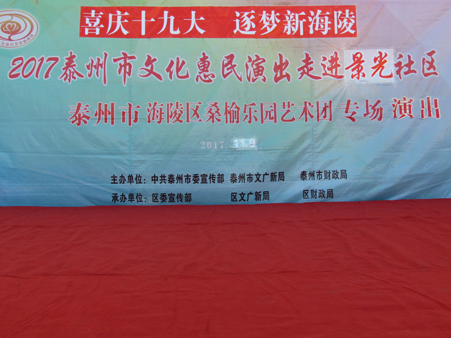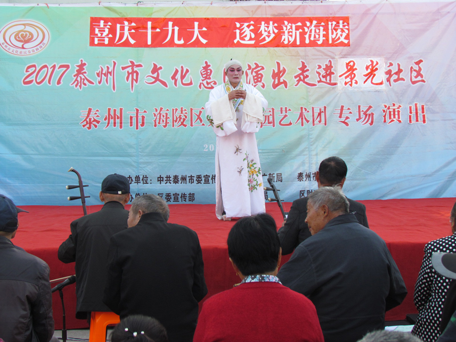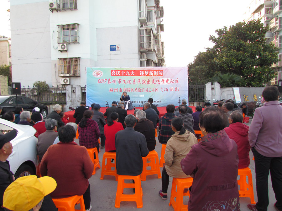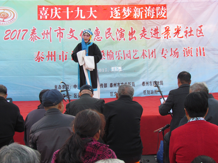 2017年11月9日下午2:30分,多云,初冬时节,气候宜人,在城西街道景光社区文化广场,海陵区桑榆乐园艺术团为景光社区的父老乡亲们送去了一台精彩的戏曲专场演出,有淮剧《赵五娘》折子戏选段“别家”,有扬剧《安寿宝卖身》折子戏选段“破庙失子”以及扬淮折子戏选段“十八相送”等,近200名群众对每一个节目都报以热烈的掌声,有的节目演出后,群众还要求再来一段,艺术团都一一满足群众的要求,精彩的演出在城西景光社区一带形成了一道亮丽的风景线。