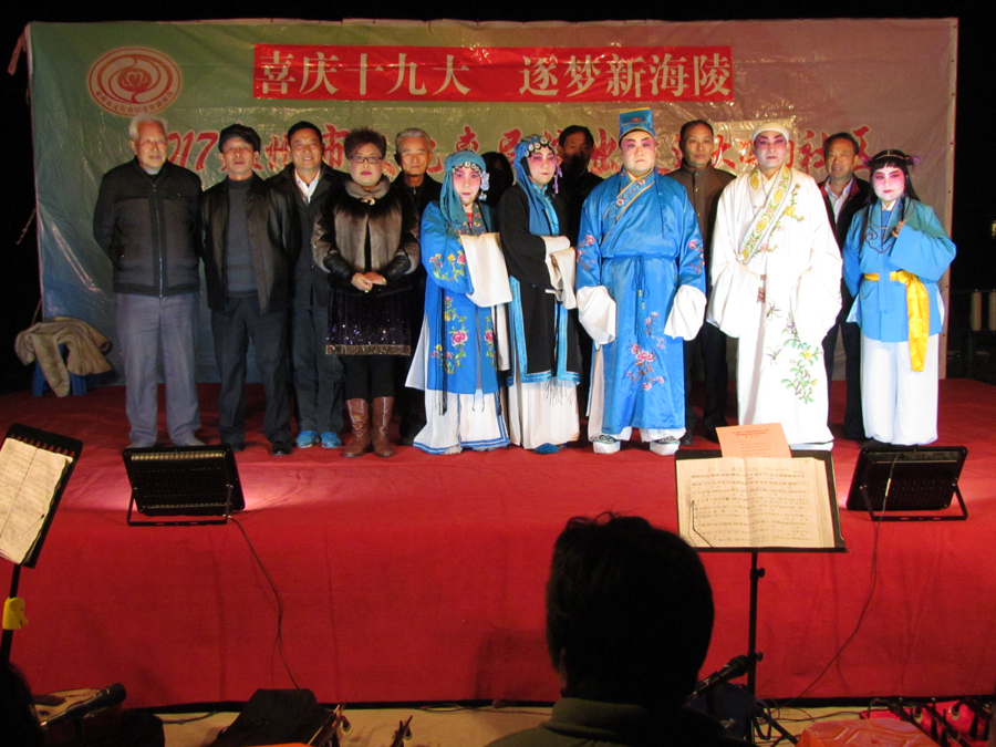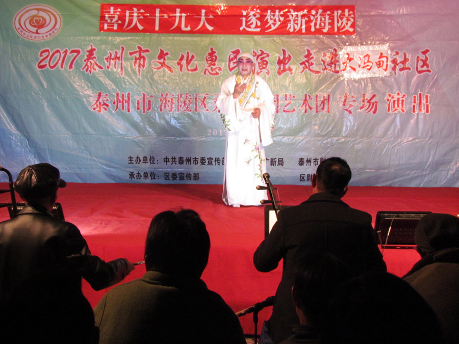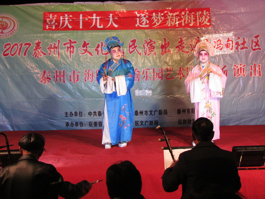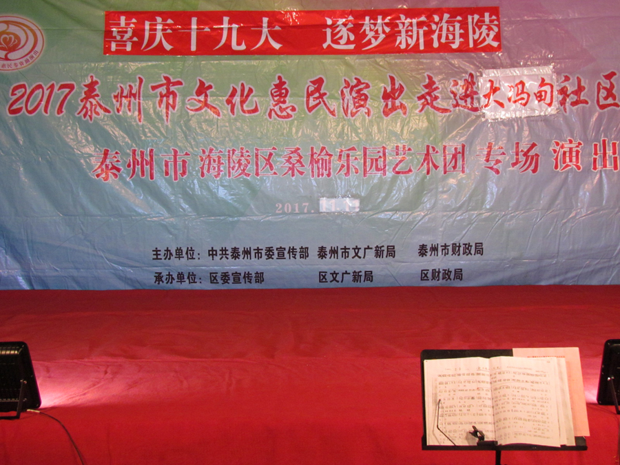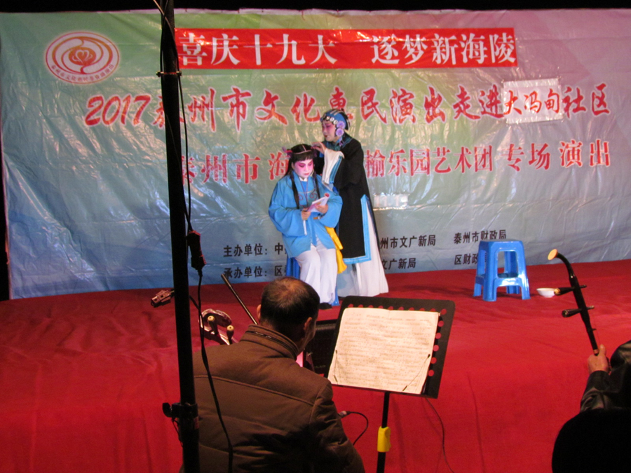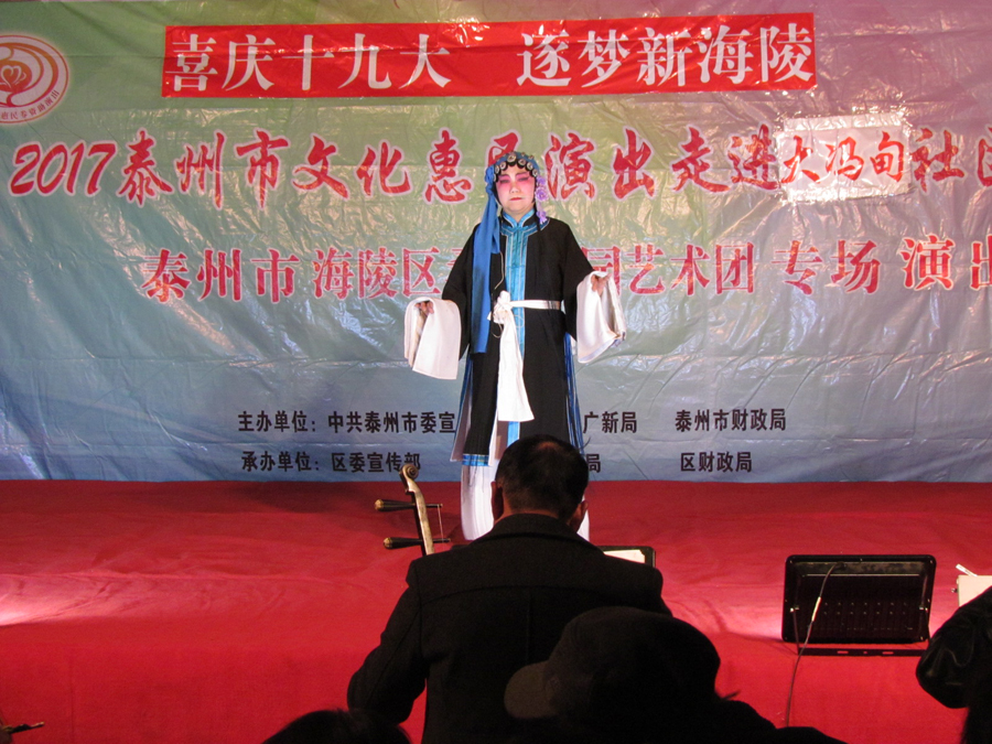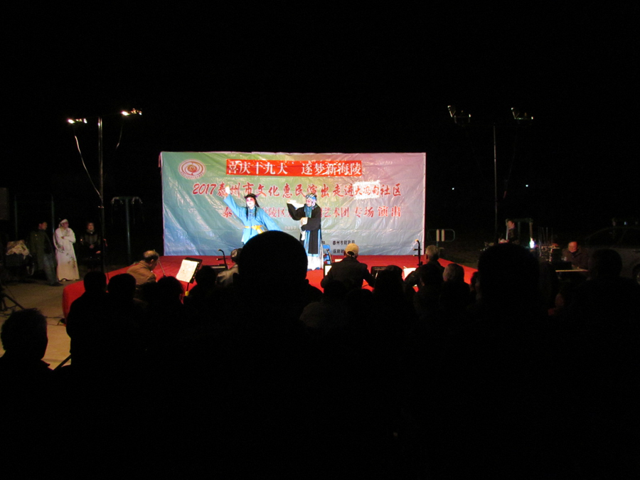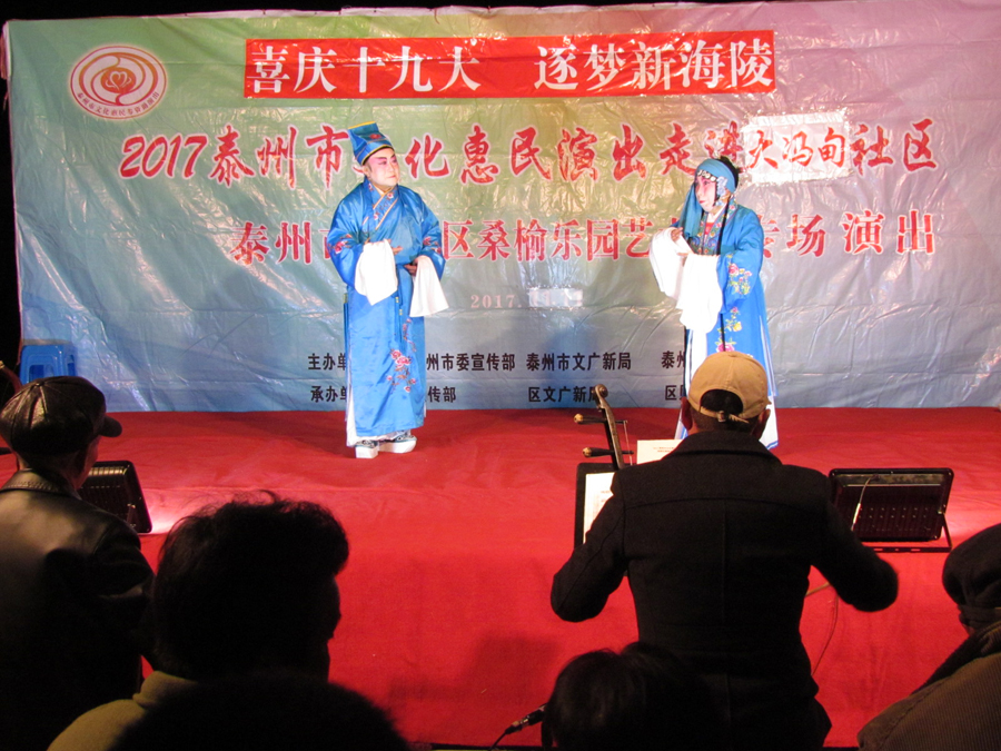 2017年11月11日晚18:30分,多云,初冬时节,气候宜人,在苏陈镇大冯甸村文化广场,海陵区桑榆乐园艺术团为大冯甸村的父老乡亲们送去了一台精彩的戏曲专场演出,有淮剧《赵五娘》折子戏选段“别家”,有扬剧《安寿宝卖身》折子戏选段“破庙失子”以及扬淮折子戏选段“十八相送”等,近200多名群众对每一个节目都报以热烈的掌声,有的节目演出后,群众还要求再来一段,艺术团都一一满足群众的要求,精彩的演出在苏陈大冯甸村、梅兰路东南一带形成了一道亮丽的风景线。