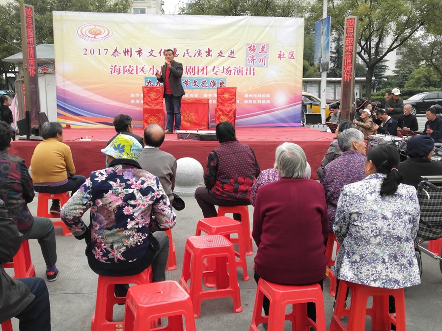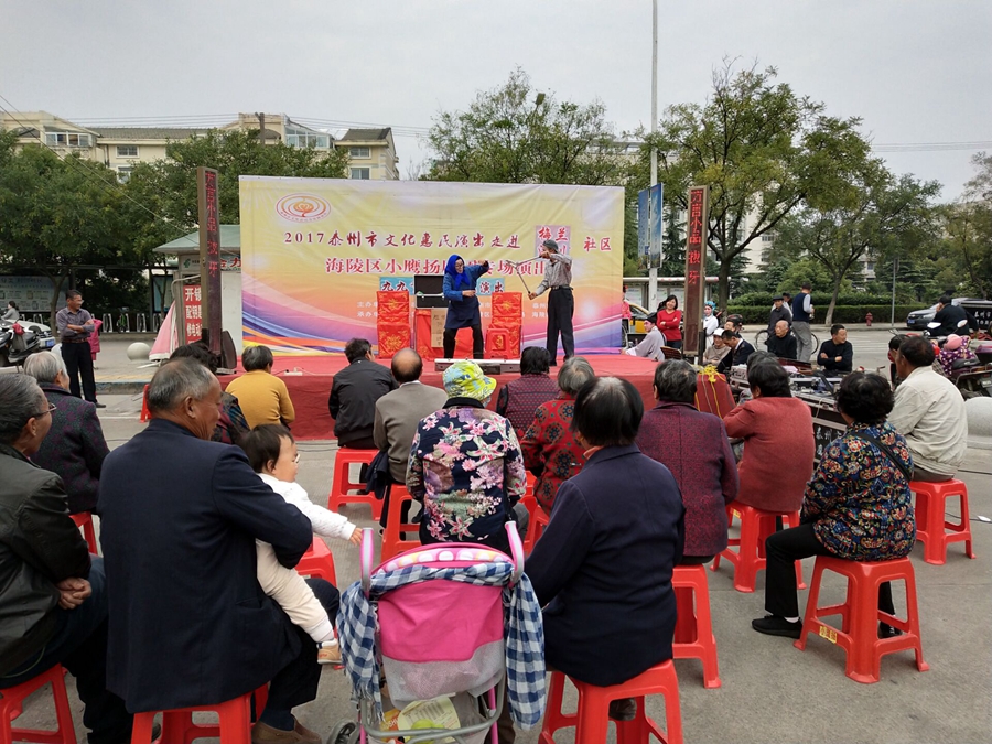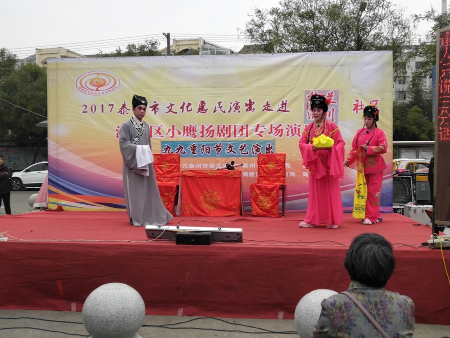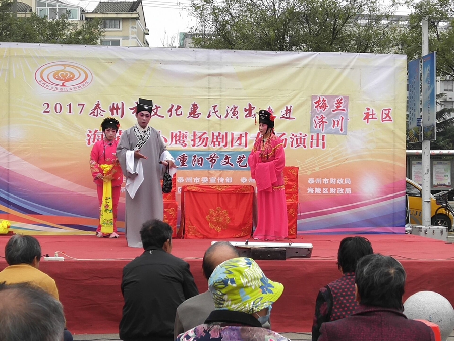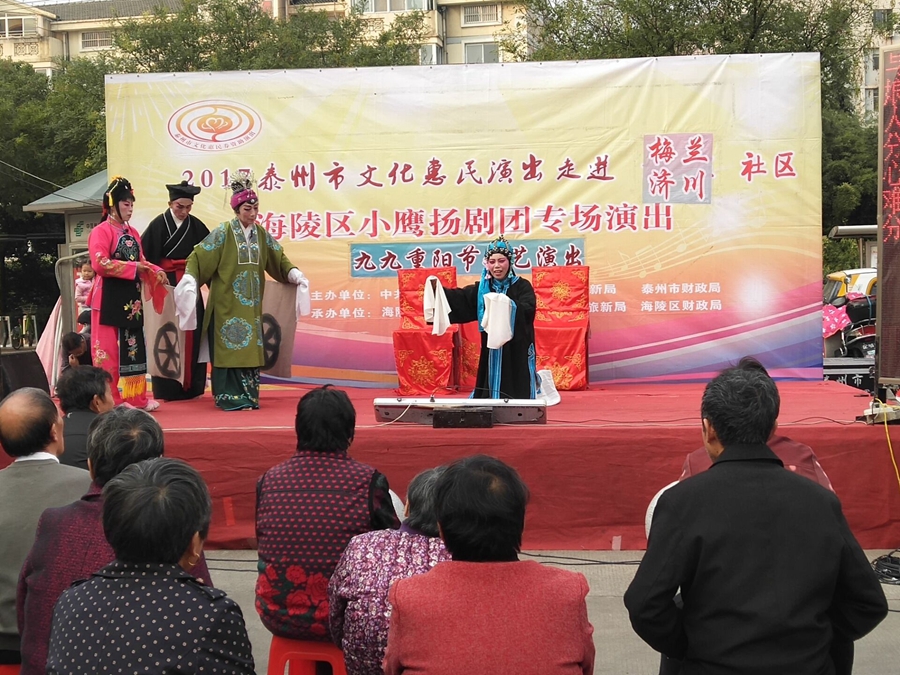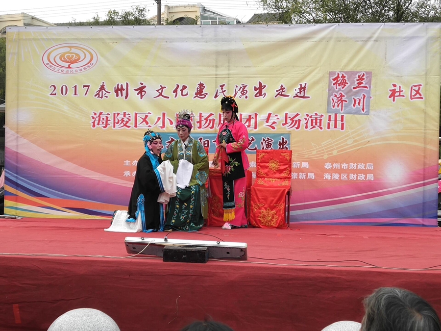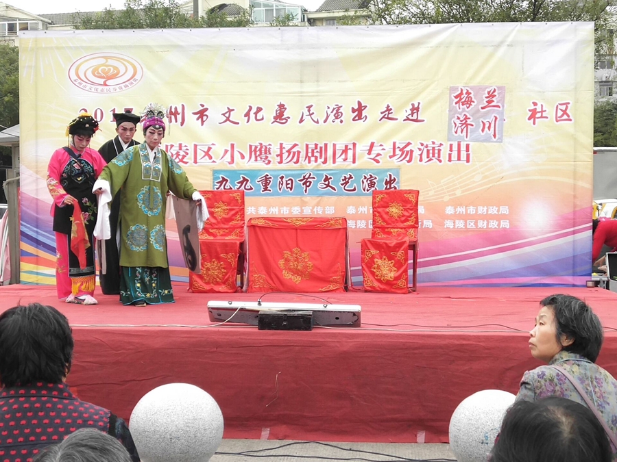 2017泰州市文化惠民演出走进海陵区城南街道梅兰社区,海陵区小鹰扬剧团专场演出,2017年10月26日下午在海陵区城南街道梅兰社区莲花二区北大门成功举办。小品《方言拔牙》和经典的扬剧折子戏表演唱,博得了观众的阵阵掌声。演出很成功!感谢社区领导提供全方位的服务!