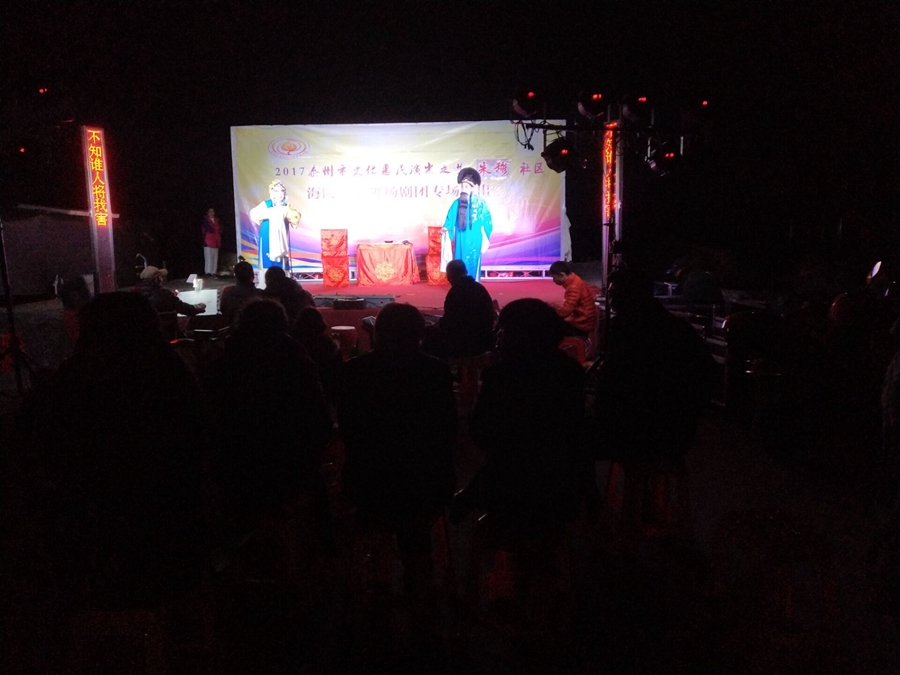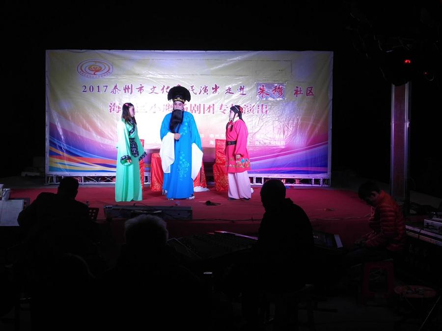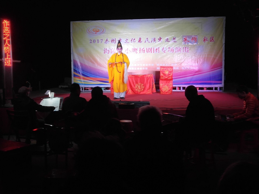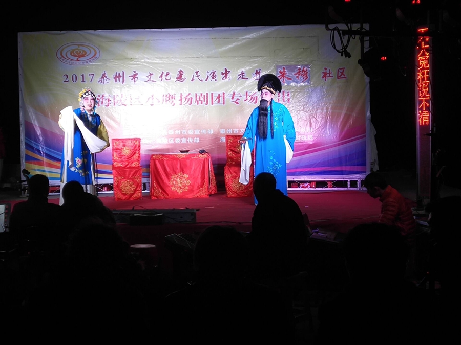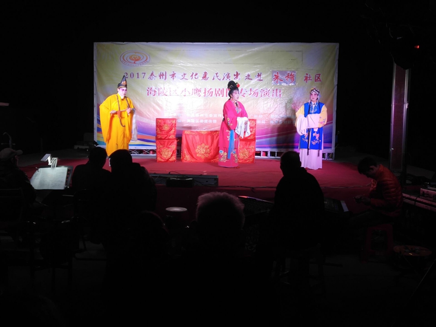 2017泰州市文化惠民演出走进朱穆社区,海陵区小鹰扬剧团专场演出,于2017年11月4日晚上在泰州医药高新区凤凰街道朱穆社区百姓大舞台成功举办。本场演出剧目为大型扬剧《分裙记》,此剧剧情跌宕起伏,曲折动人,最终坏人得到了应有的下场,演员们精彩的表演唱博得了观众的阵阵掌声。演出很成功!外面天气虽然气温很低,但是并没有削减大家看扬剧的热情!