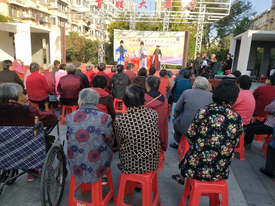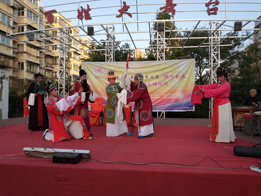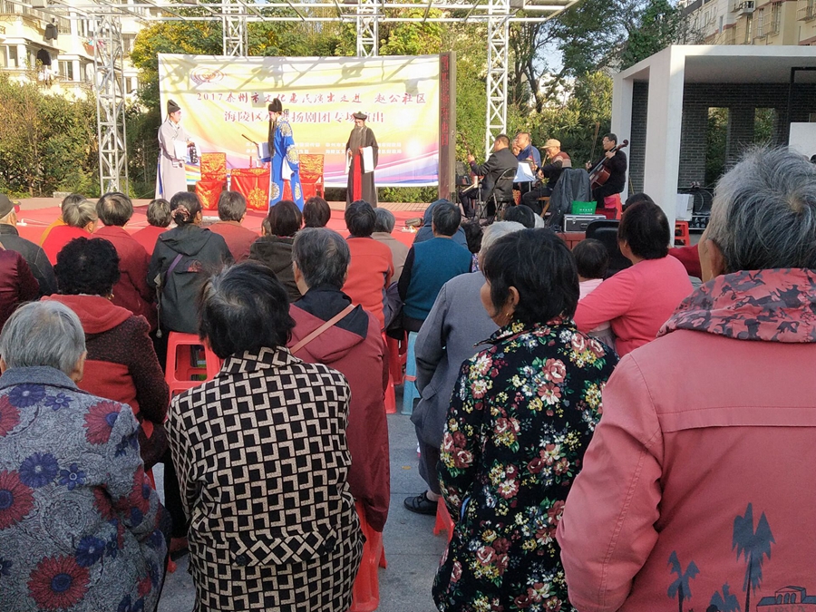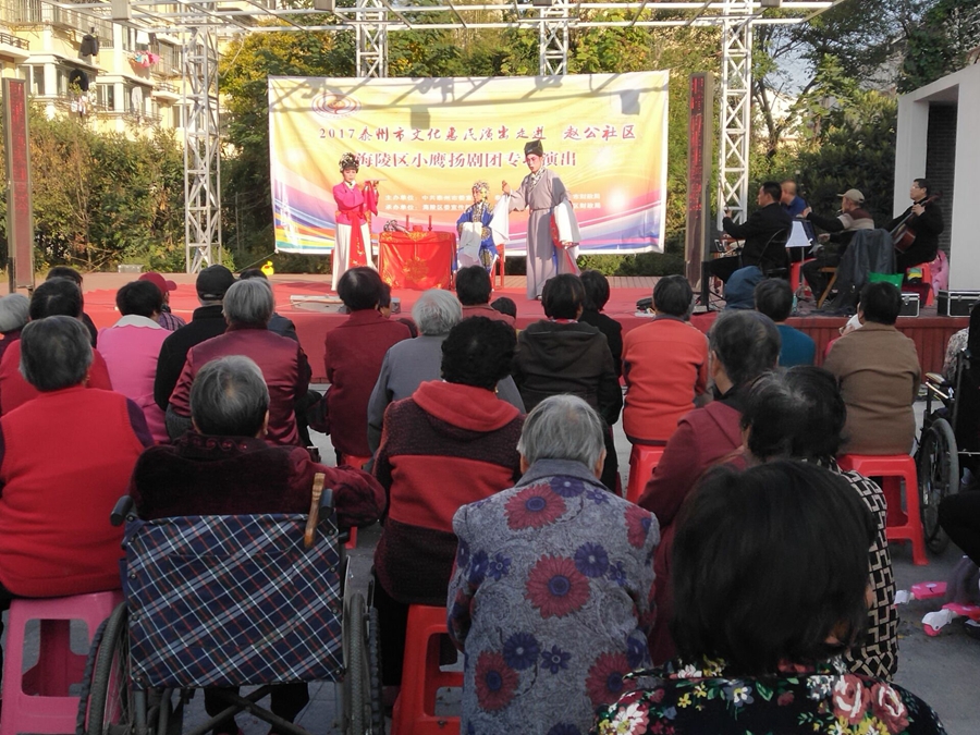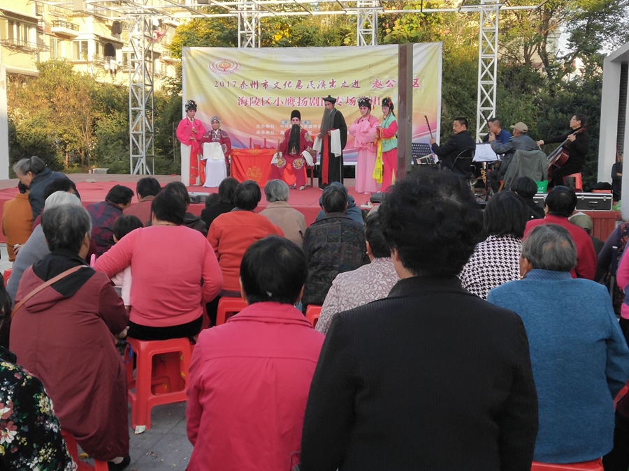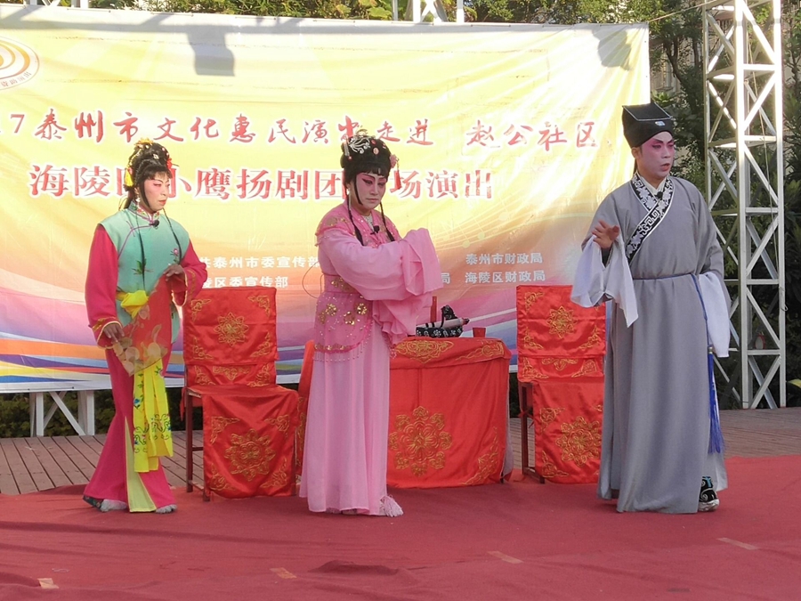泰州市2017文化惠民演出走赵公社区,海陵区小鹰扬剧团专场演出,2017年11月9日下午在泰州市海陵区城北街道赵公社区森园小区欢乐广场成功举办。本次演出剧目为传统扬剧《珍珠塔》,剧中姑妈妈的势利,嫌贫爱富的举动受到观众的谴责,剧情大义就是告诉世人,人穷不能穷一辈子,三十年河东转河西,姑妈嫌她侄儿方卿穷,上门来投亲,都不相认,并且说了好多刺激他的话,说他没有高官做,方卿后来励志苦读三年书,考举了头名状元,唱道情羞辱他的姑妈,让她改掉势利的坏习惯。演员们精彩的演出,博得了观众的阵阵掌声。演出很成功!感谢社区领导提供全方位的服务!