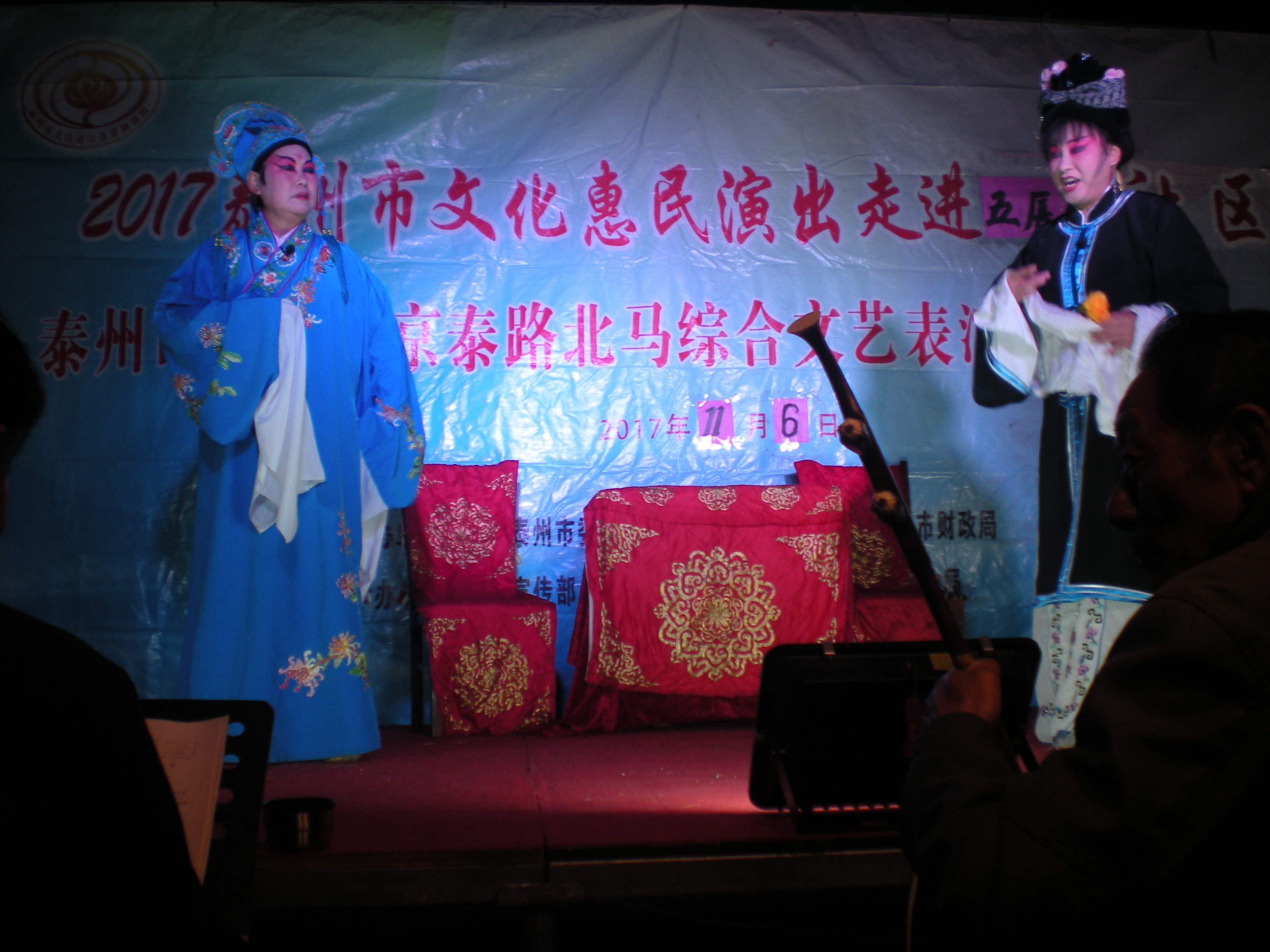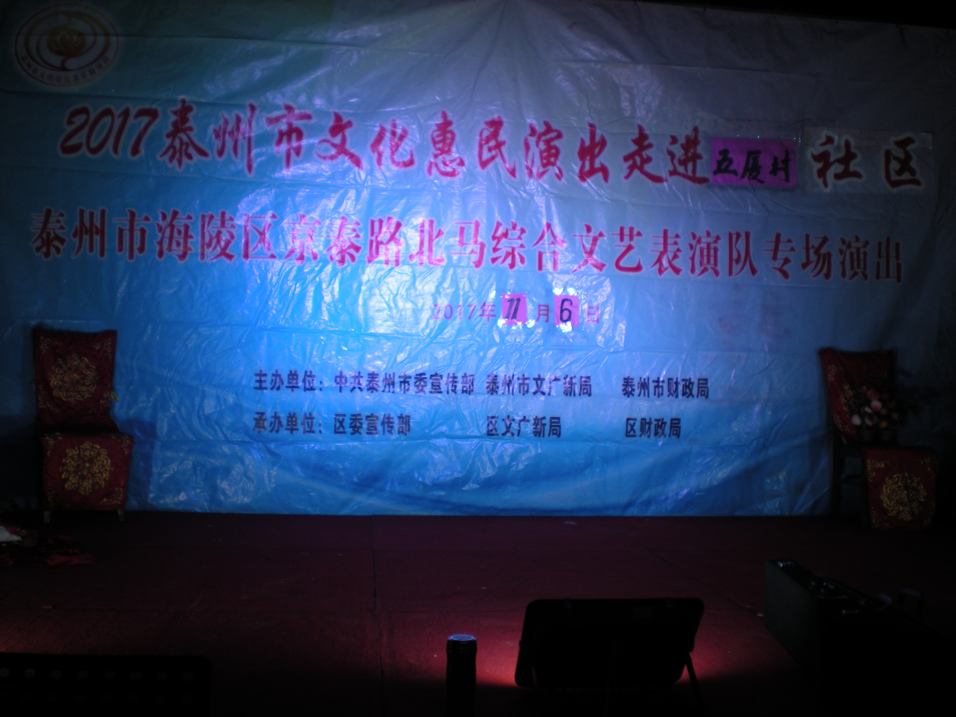11月6日下午京泰路北马综合文艺表演队走进九龙五厦村文化广场举办文化惠民演出。这场演出的曲目是扬剧《五女拜寿》,精彩演出和演员们的深厚功底以及精湛的演技赢得了居民们阵阵喝彩,村民们纷纷感慨不已。演出结束后,居民们纷纷表示这样的活动很好,一致认为这样的活动既丰富了文化生活,又宣扬了传统美德,这次戏曲在该社区演出受到村民们的一致好评,村干部和文化志愿者服务周到