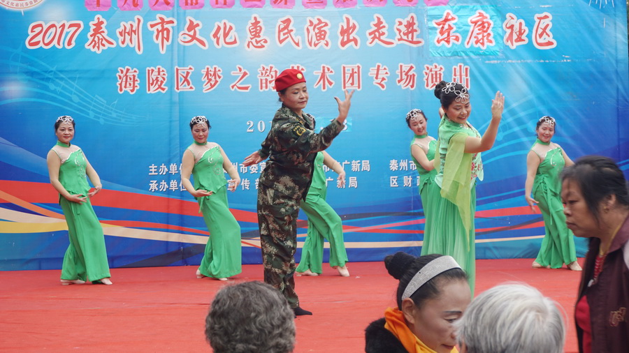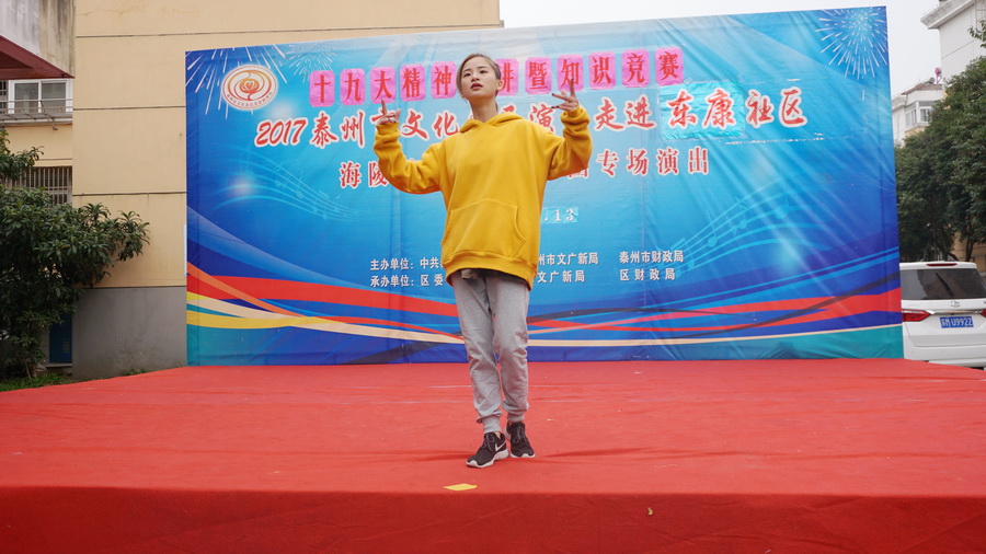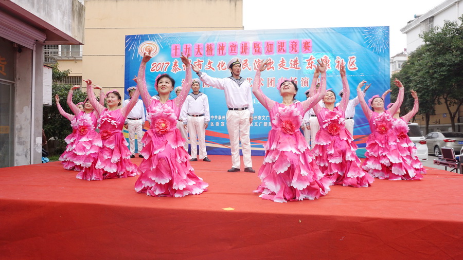 2017年11月13日,梦之韵艺术团应城东街道邀请,赴东康社区进行惠民演出及宣传党的“十九大”精神。当日下午,搭建在东康社区广场上的惠民舞台前早已聚集了不少的观众,舞台背景墙上“十九大精神宣讲及知识竞赛”格外抢眼。据了解,社区干部非常赞赏梦之韵艺术团通过惠民演出的平台上,以老百姓喜闻乐见的“有奖抢答”形式宣传党的“十九大”精神,并广而告之社区居民前来观看演出参加“十九大”知识竞赛活动......。演出节目依然是一如既往的靓丽精彩,知识“抢答”依旧是异乎寻常紧张愉悦,社区丁书记还亲临现场登台为居民宣讲党的“十九大”报告精神.......。梦之韵艺术团着力创新惠民演出宣传平台,在为社区居民带来精彩的视觉盛宴享受的同时,也及时将党的“十九大”精神传递到老百姓之中,着实为惠民演出增彩生辉。